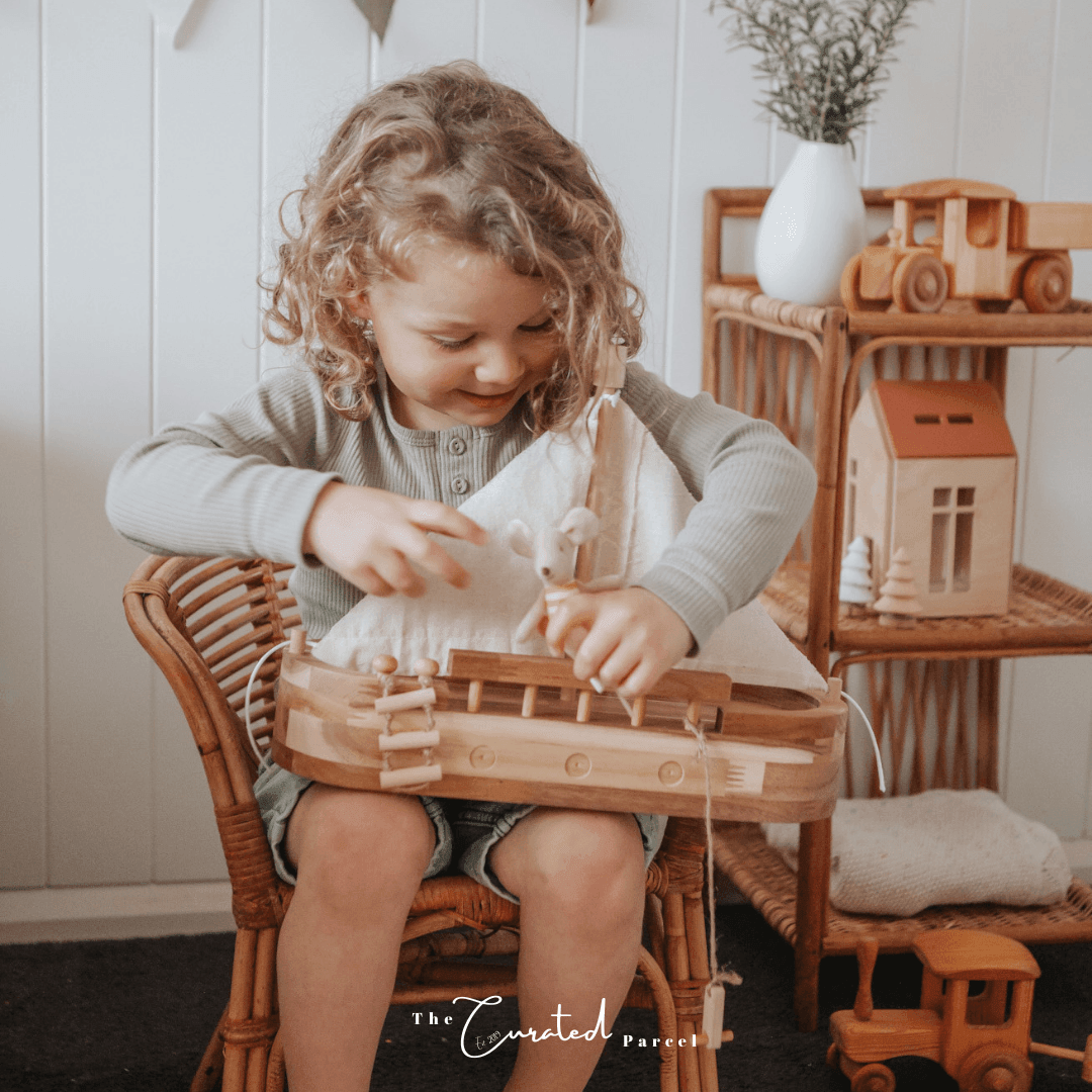 The newest ship to join our range, the Adventure ship! Ready for adventures and imaginative play! This adventure ship comes with 2 dolls (gnomes) and accessories. The item is 100% handmade from Acacia and Lychee wood, very sturdy and made to last. All Qtoys products are made from plantation timber, using non toxic, child safe materials.