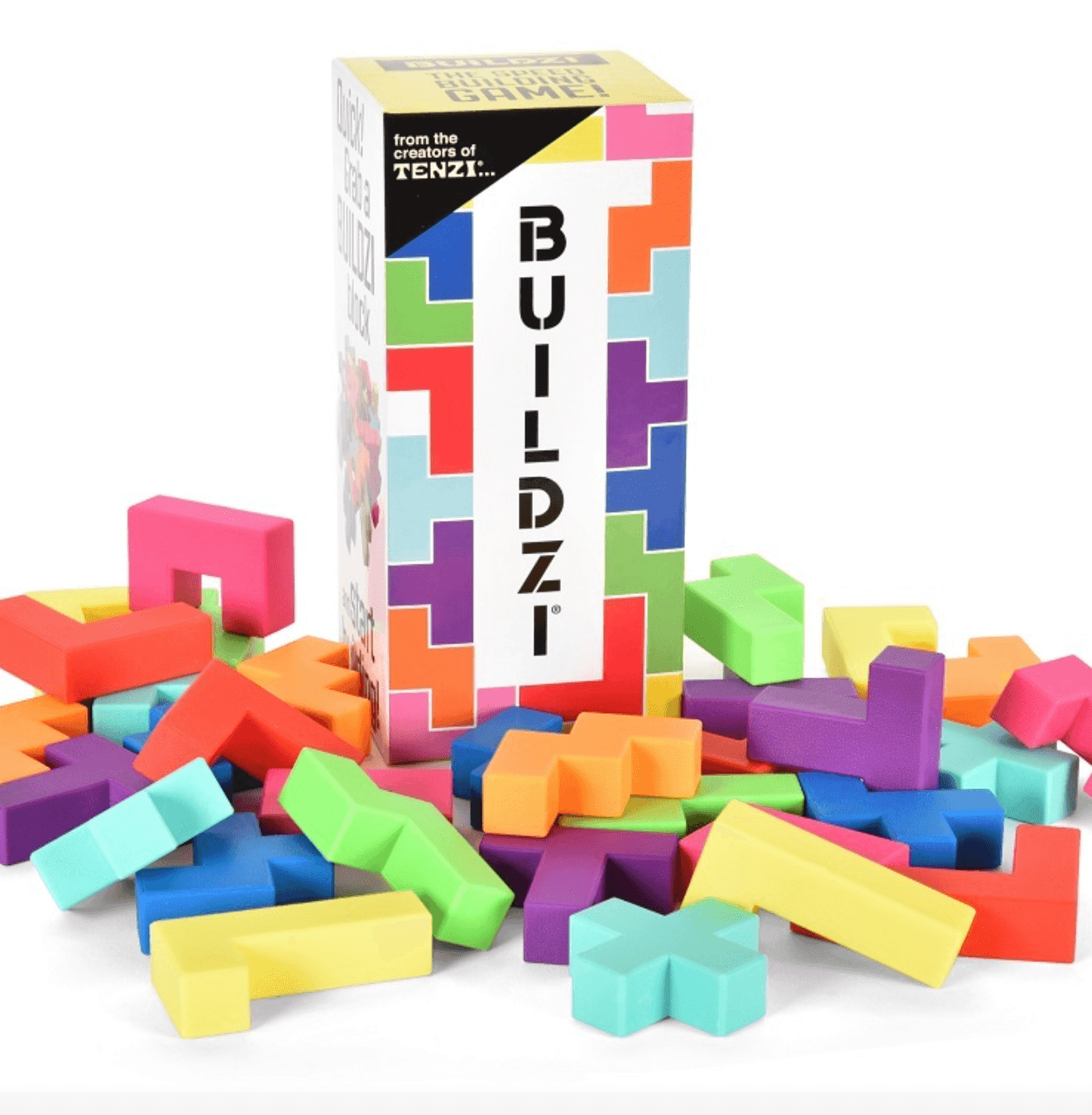 BUILDZI - The speed building game! BUILDZI is a game of 2-4 players. There is lots of ways to play BUILDZI. We love playing it as a speed game where towers are built VERTICALLY on the table/surface. This makes for fast-stacking, nerve-racking gameplay!