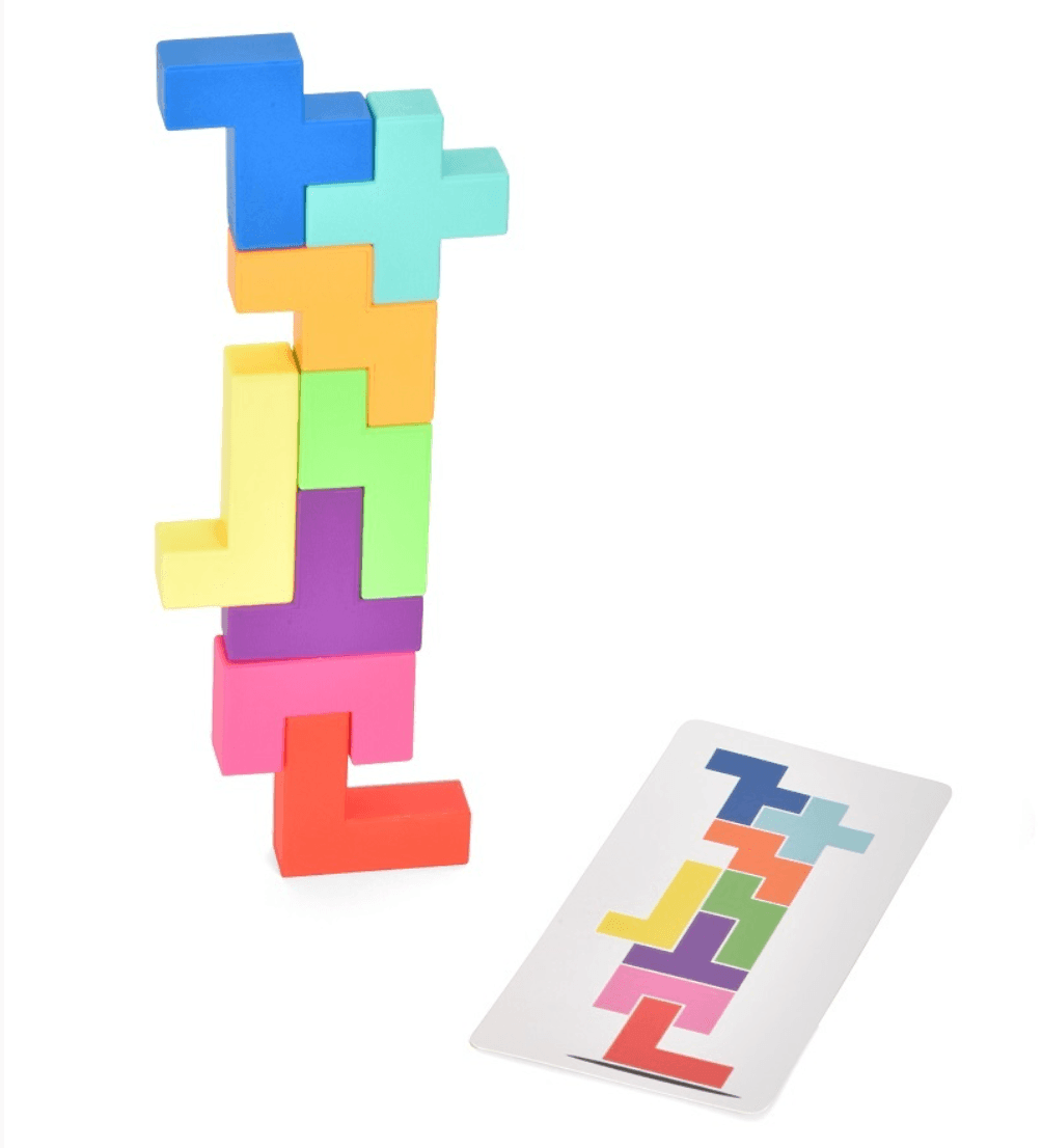 For more challenging games try building the towers on the yellow/black side. These towers are a bit trickier to build and don’t have colours to help identify the blocks!