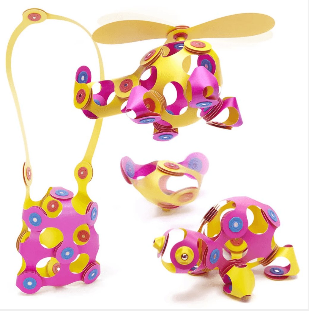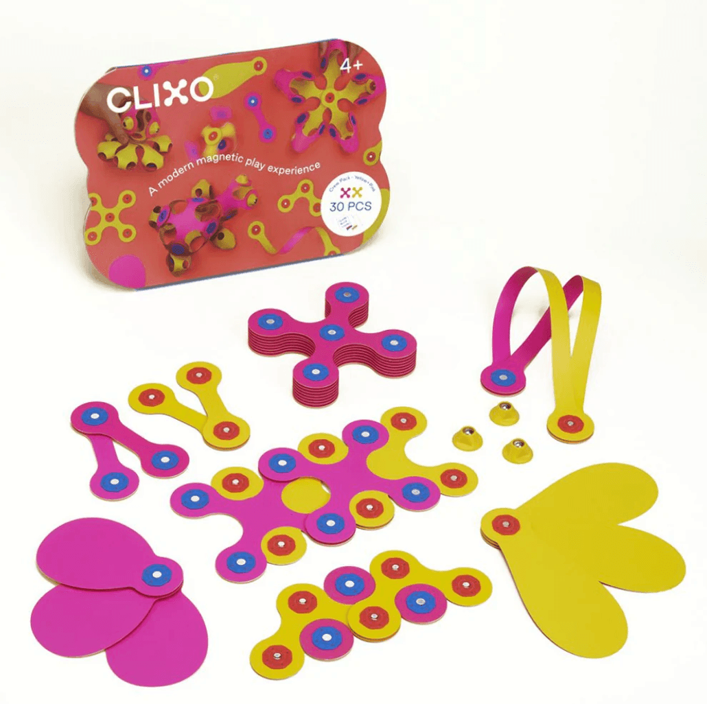 The Clixo crew pack features 30 pcs in 8 different shapes including 2 spinners, a quick start guide along with yellow and pink pieces.