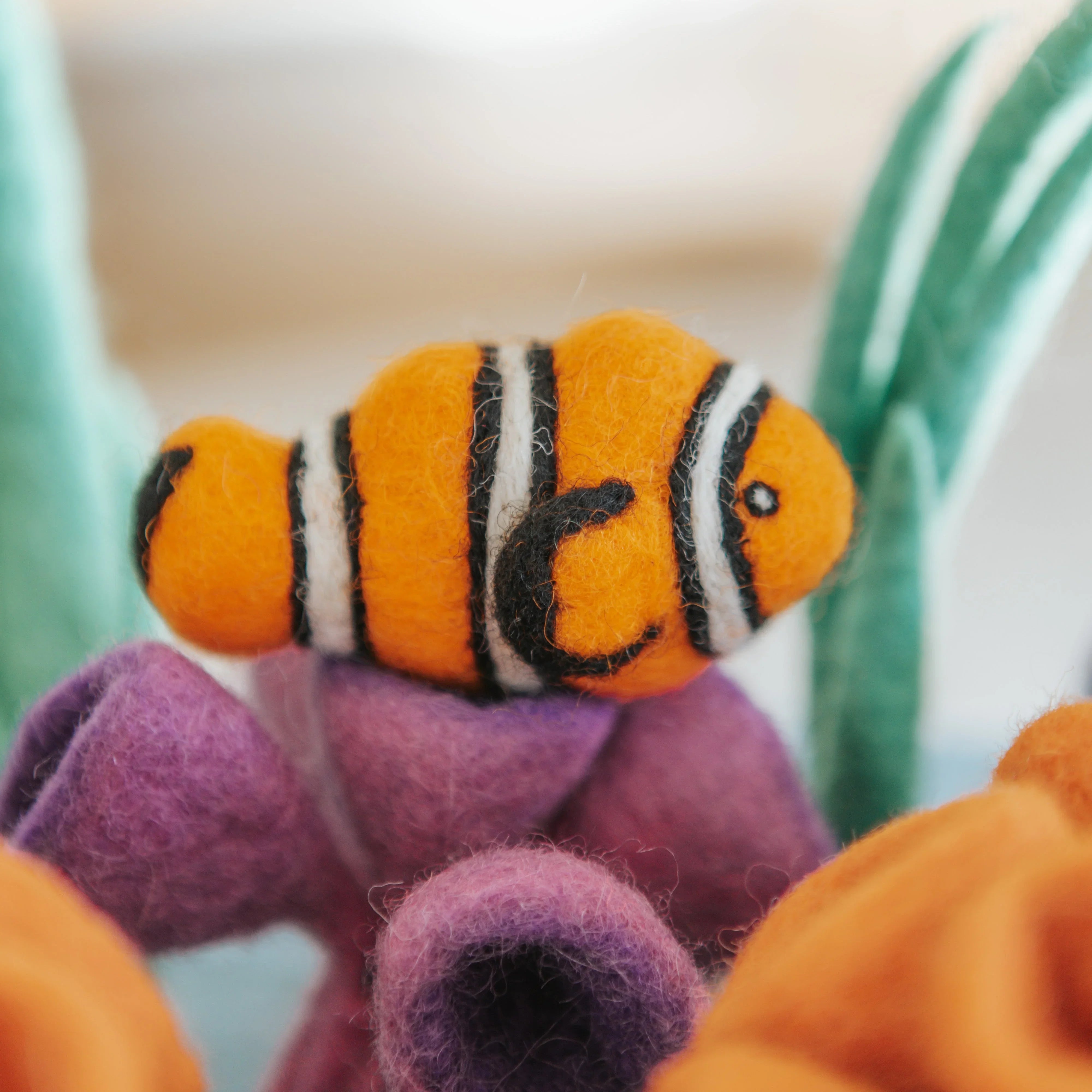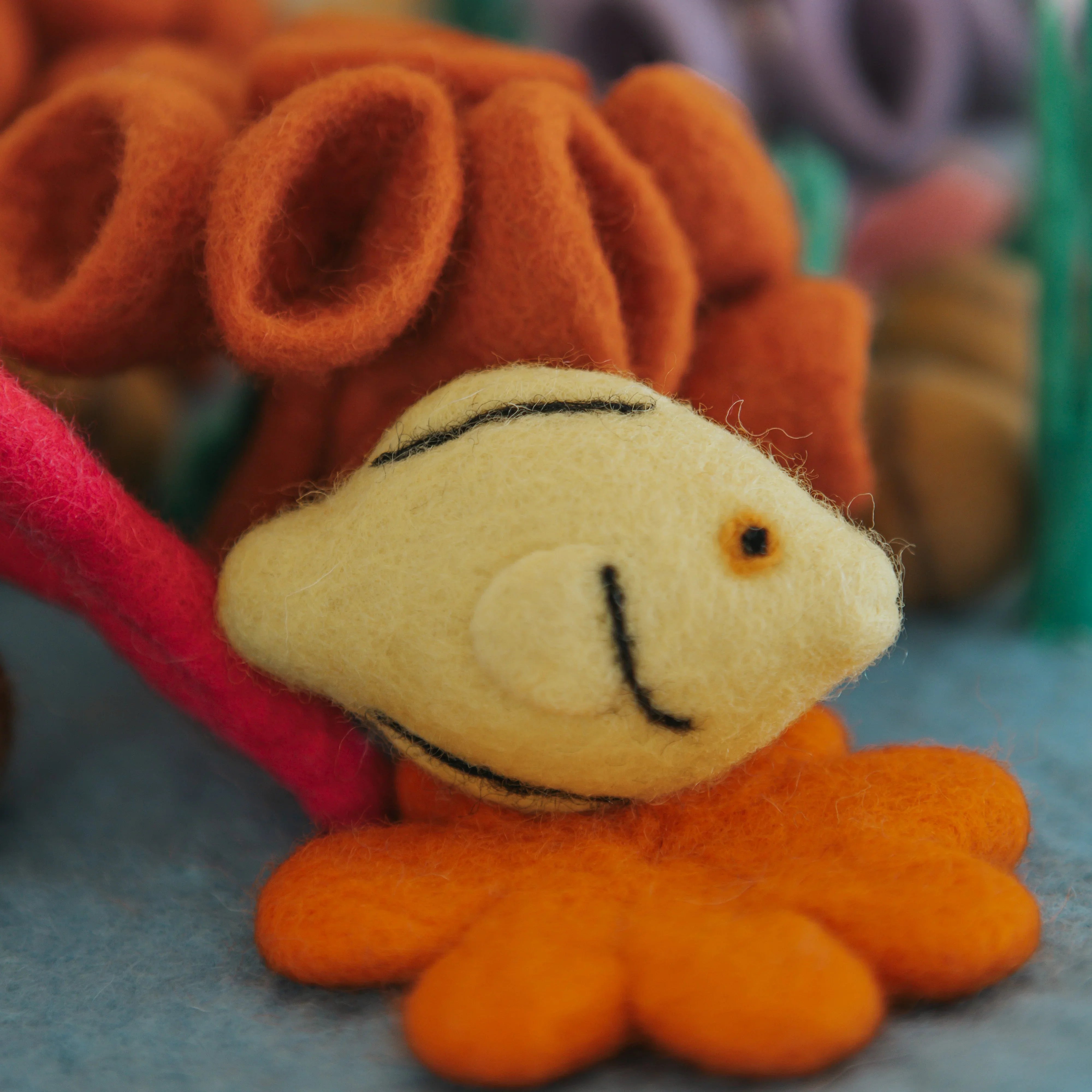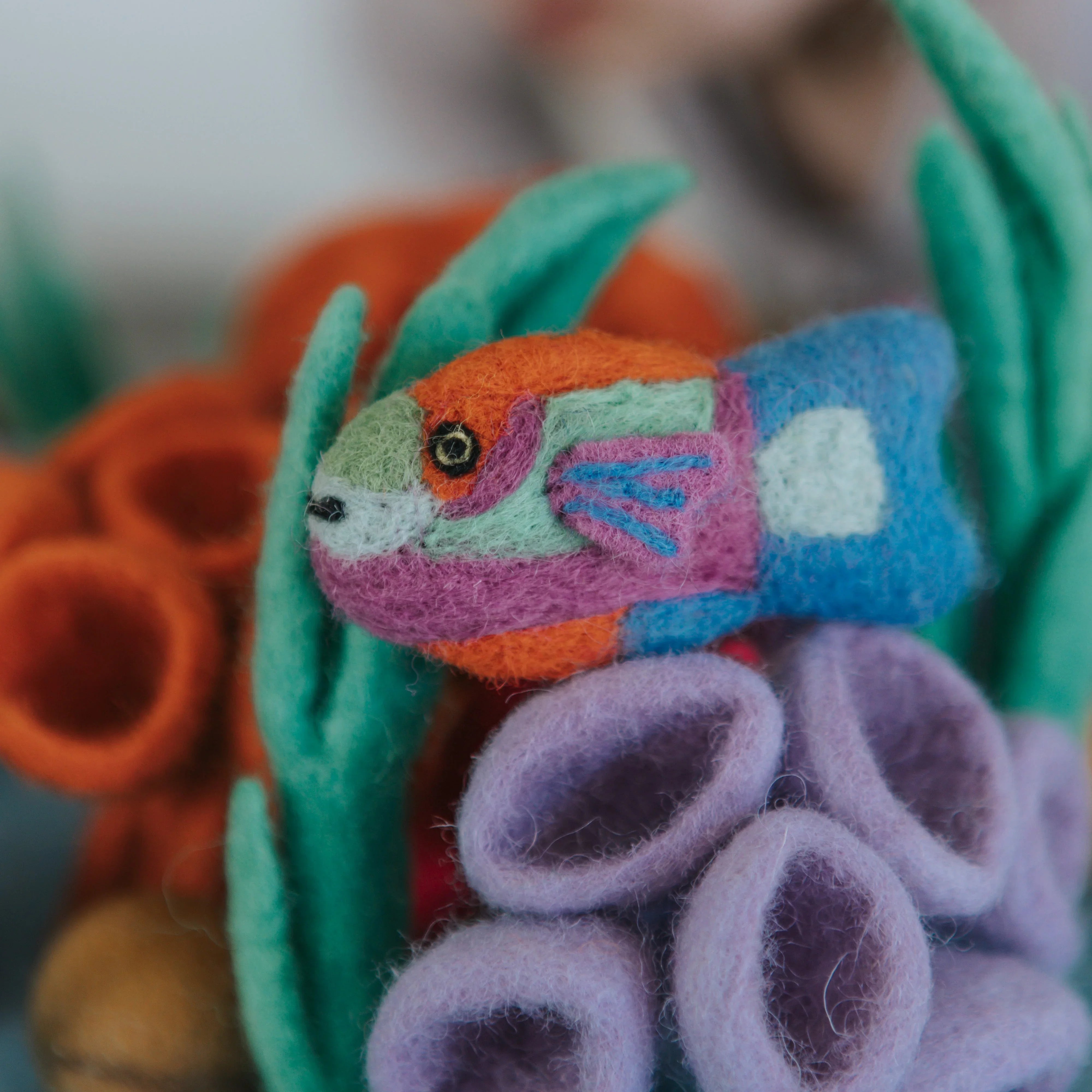 Dive into a world of vibrant colours and marine wonder with our Coral Reef Fish Toys - Parrot Fish, Clownfish, Yellow Tang, Blue Tang, Butterfly Fish, Clownfish, Sea Horse and Green Sea Turtle. Handfelted with care and attention to detail, these adorable toys are perfect for children and nature enthusiasts alike.