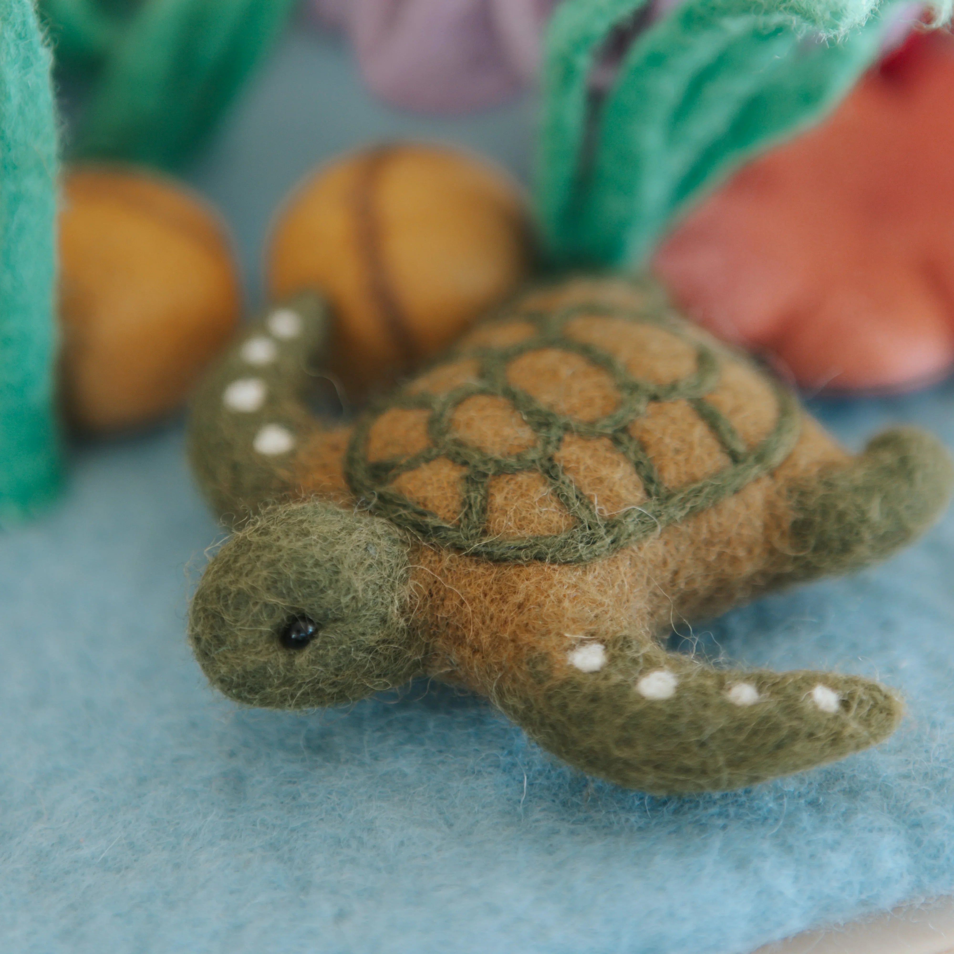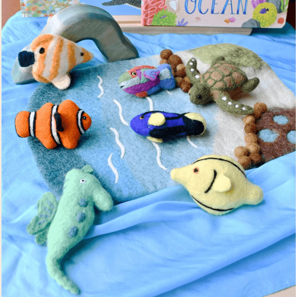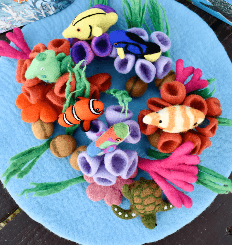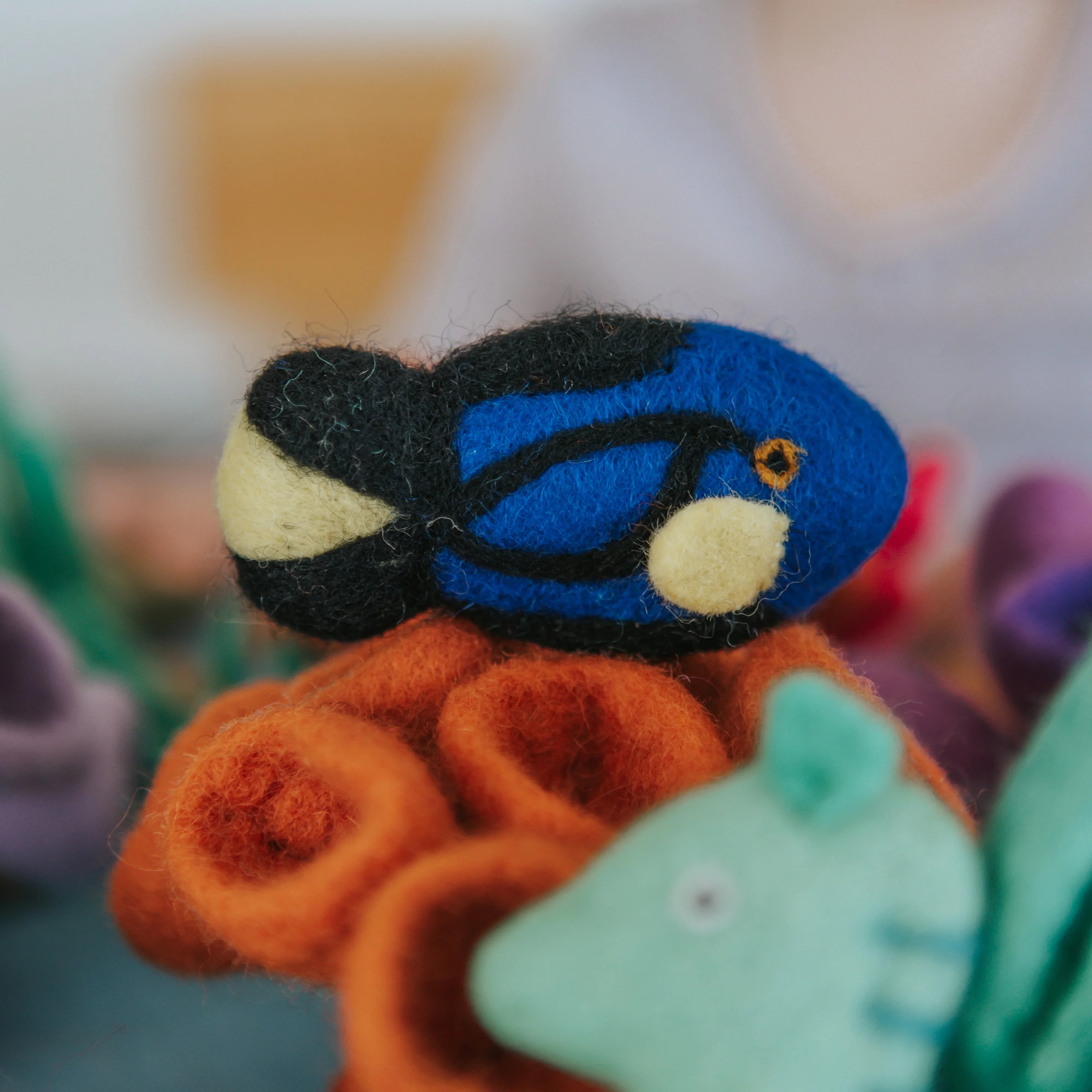 Dive into a world of vibrant colours and marine wonder with our Coral Reef Fish Toys - Parrot Fish, Clownfish, Yellow Tang, Blue Tang, Butterfly Fish, Clownfish, Sea Horse and Green Sea Turtle. Handfelted with care and attention to detail, these adorable toys are perfect for children and nature enthusiasts alike.
