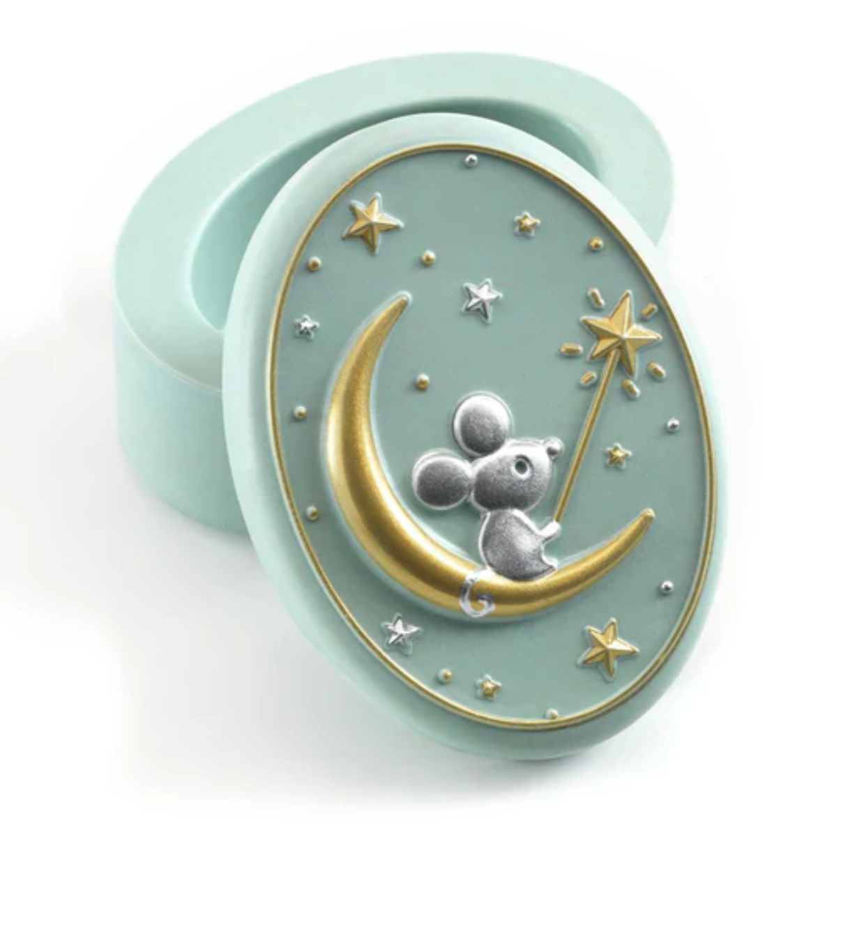 A special and pretty box to keep teeth safe while waiting for the tooth fairy to collect. The design features gold and silver metallic paint and a silicone stopper for the lid to adhere and remain closed.