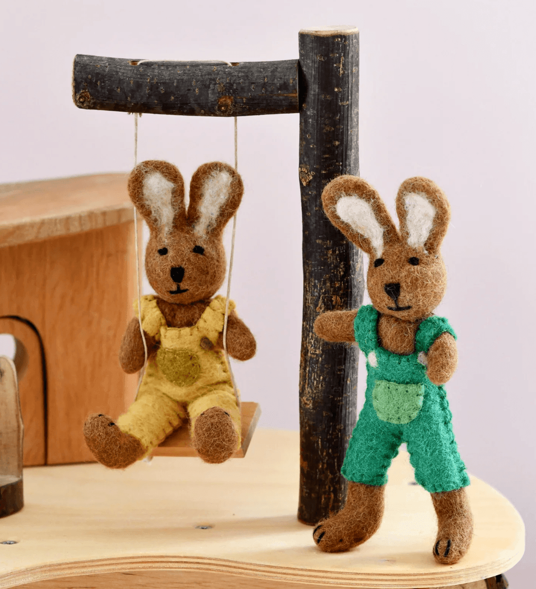 Hop into a world of imagination with our enchanting felt brown rabbit hare wearing green overalls! Crafted with meticulous attention to detail and bursting with charm, this delightful toy is sure to become a treasured companion for children everywhere.