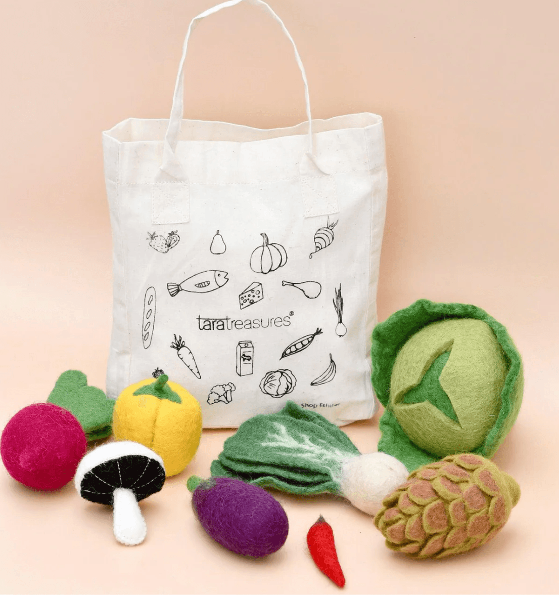 These adorable felt creations will come to you packed in a complimentary cotton market bag, serving as the perfect prop for play scenarios. Whether it's a playdate or an outdoor adventure in the backyard, little shopkeepers can take their market bag wherever their imagination leads.