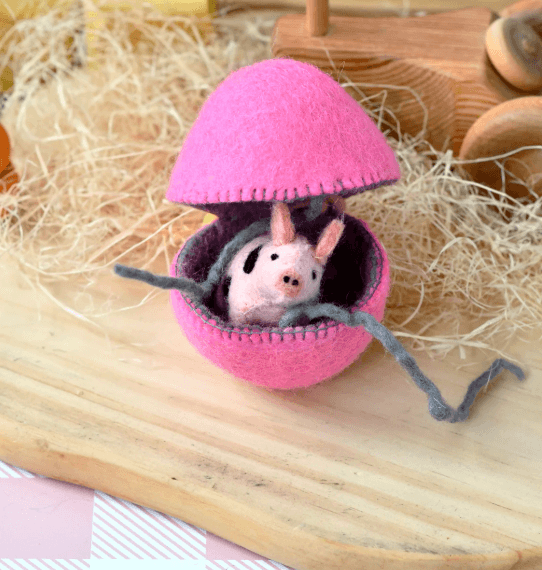 Perfect for Easter baskets, egg hunts, or as a special treat for your loved ones, our Felt Surprise Egg with Spotted Pig inside adds an element of surprise and whimsy to your holiday celebrations.