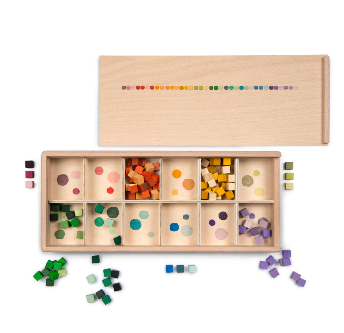 Mis and Match is a collection of colourful cubes in a wooden sorting box. The cubes