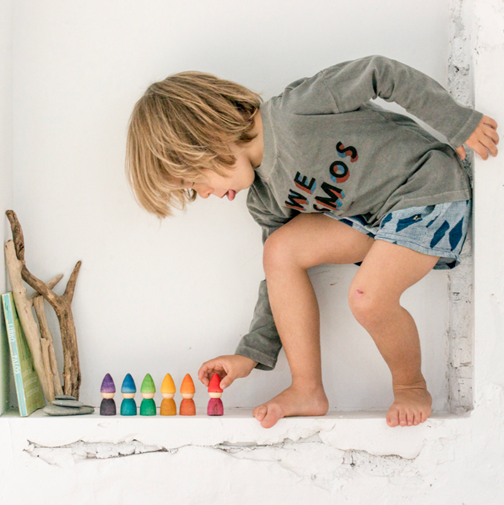 6 Rainbow Nin® Tomten 70 mm hight . The 6 Tomten allow to create a creative playing possibilities where their characters can be transformed according to the imagination of each boy or girl dreaming imaginary worlds.