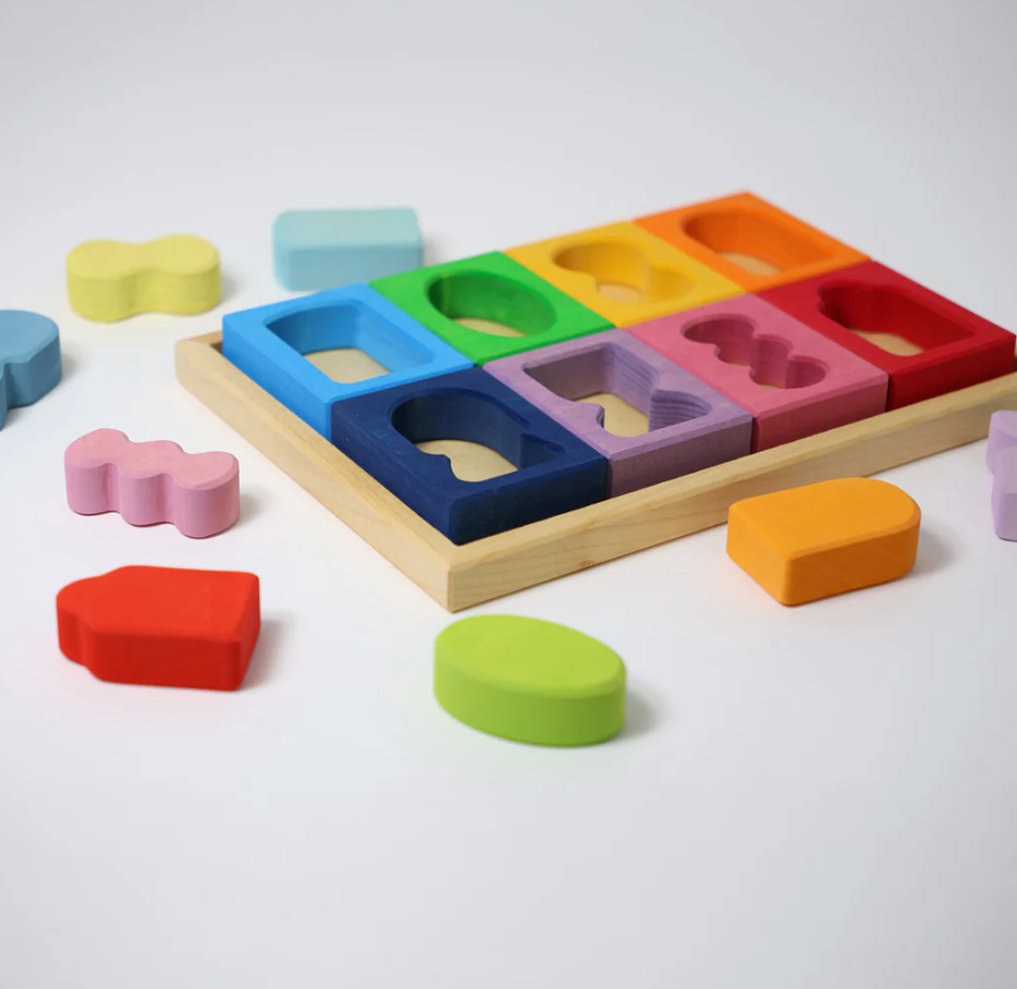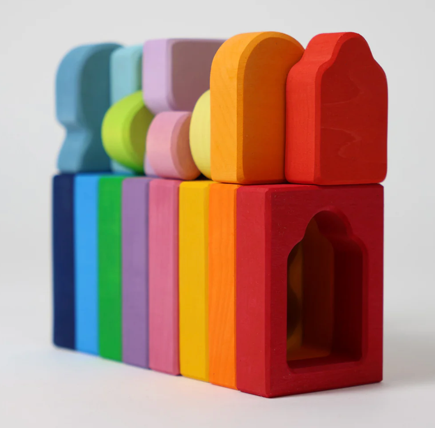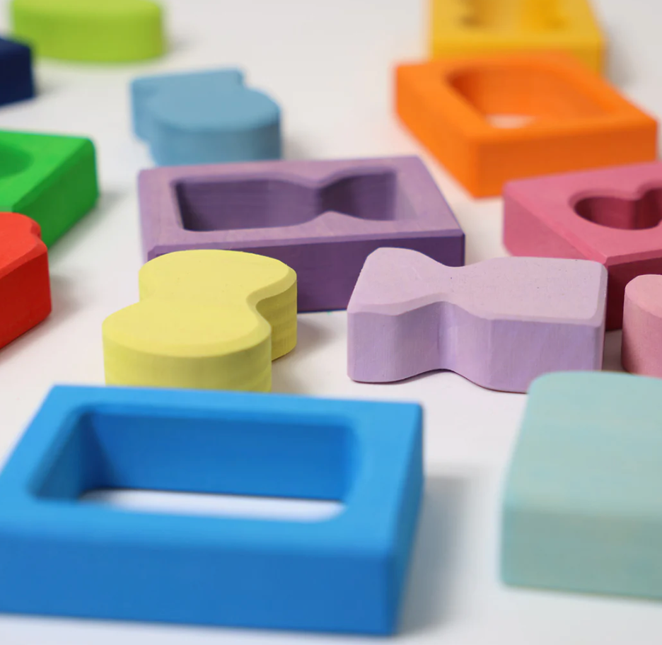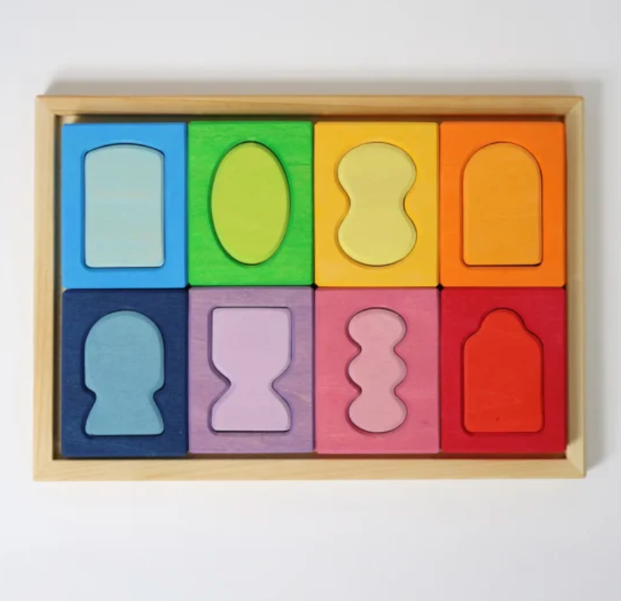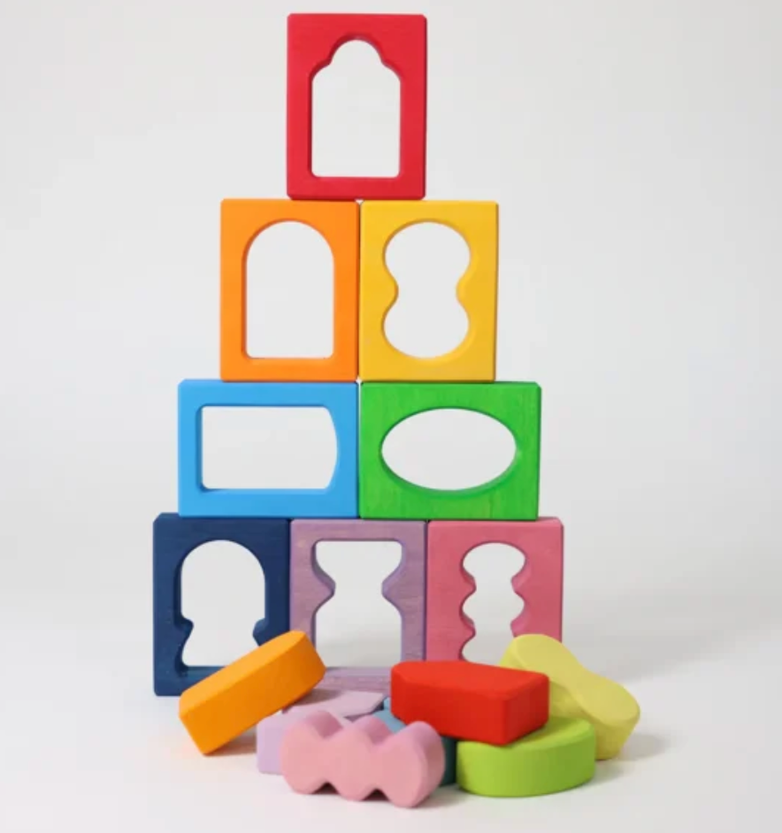 Windows give us a view of the world. Our windows in various colours and shapes are essential building elements for all types of buildings. They bring light into dark rooms and enliven monotonous facades. The Building Set is a first shape puzzle to introduce young children to matching shapes and colour harmonies.