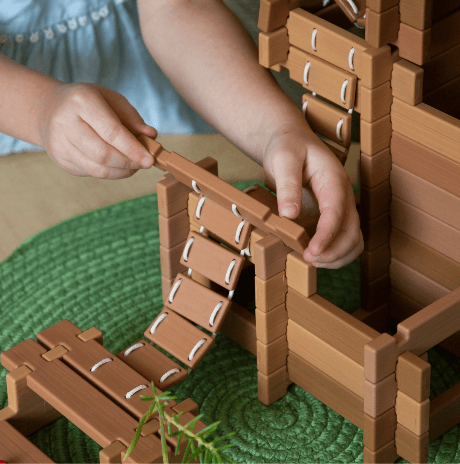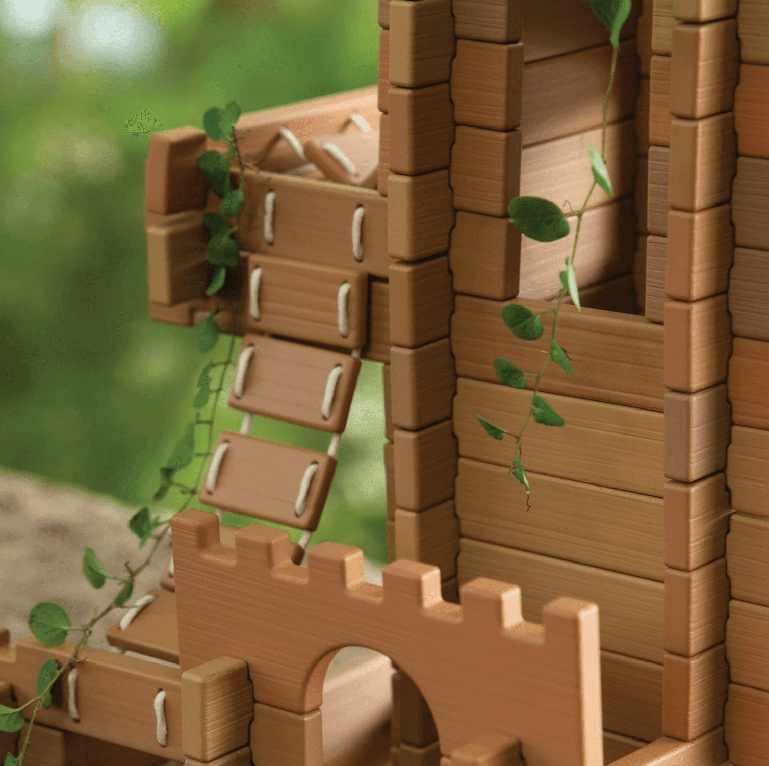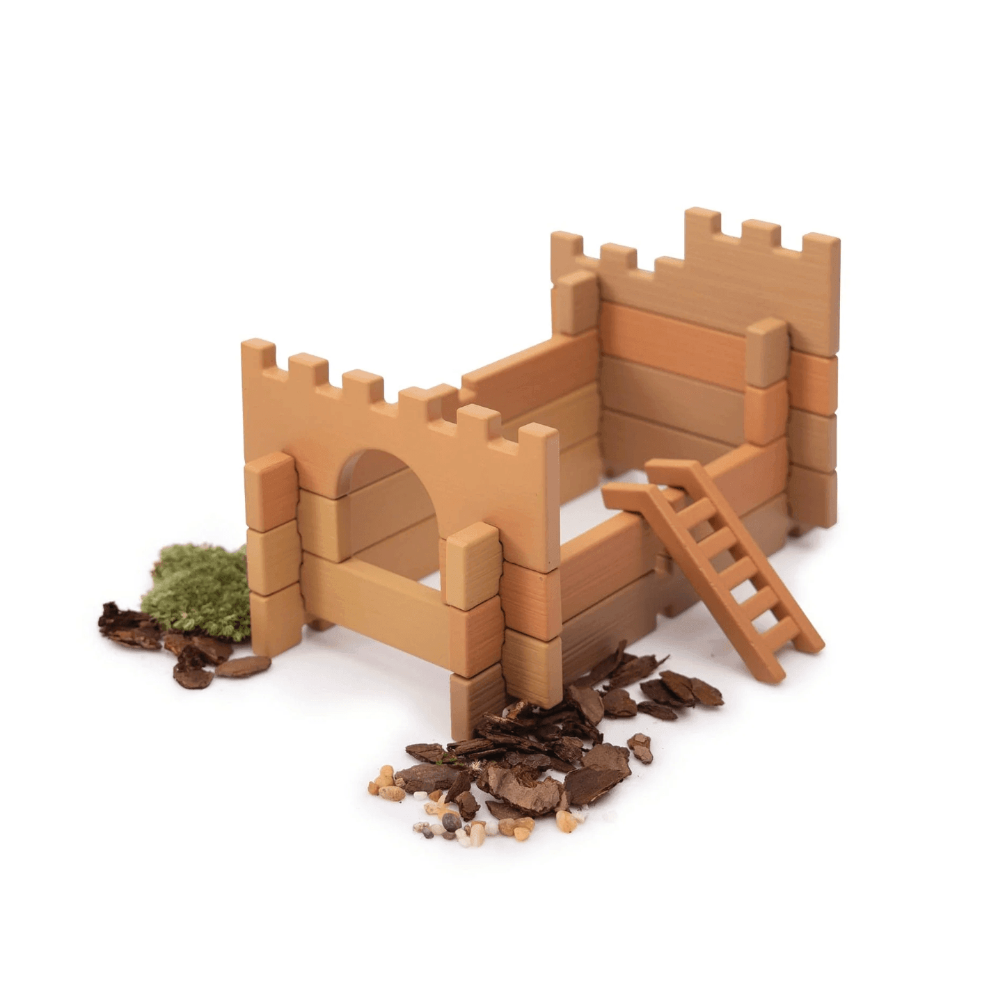 Children 3 and up can build using the Tabletop Notch Blocks – Western set indoors or outdoors. Plastic, neutral-colored blocks feature notched parts that easily connect for strong, detailed builds. Using included ladders and bridge pieces, children can build different structures with varying elevated platforms and span natural elements. 10-double sided inspiration cards provide images of relevant Western architectural design. Set features special parts with right angles inspired by Western architecture. Natural, loose parts not included.