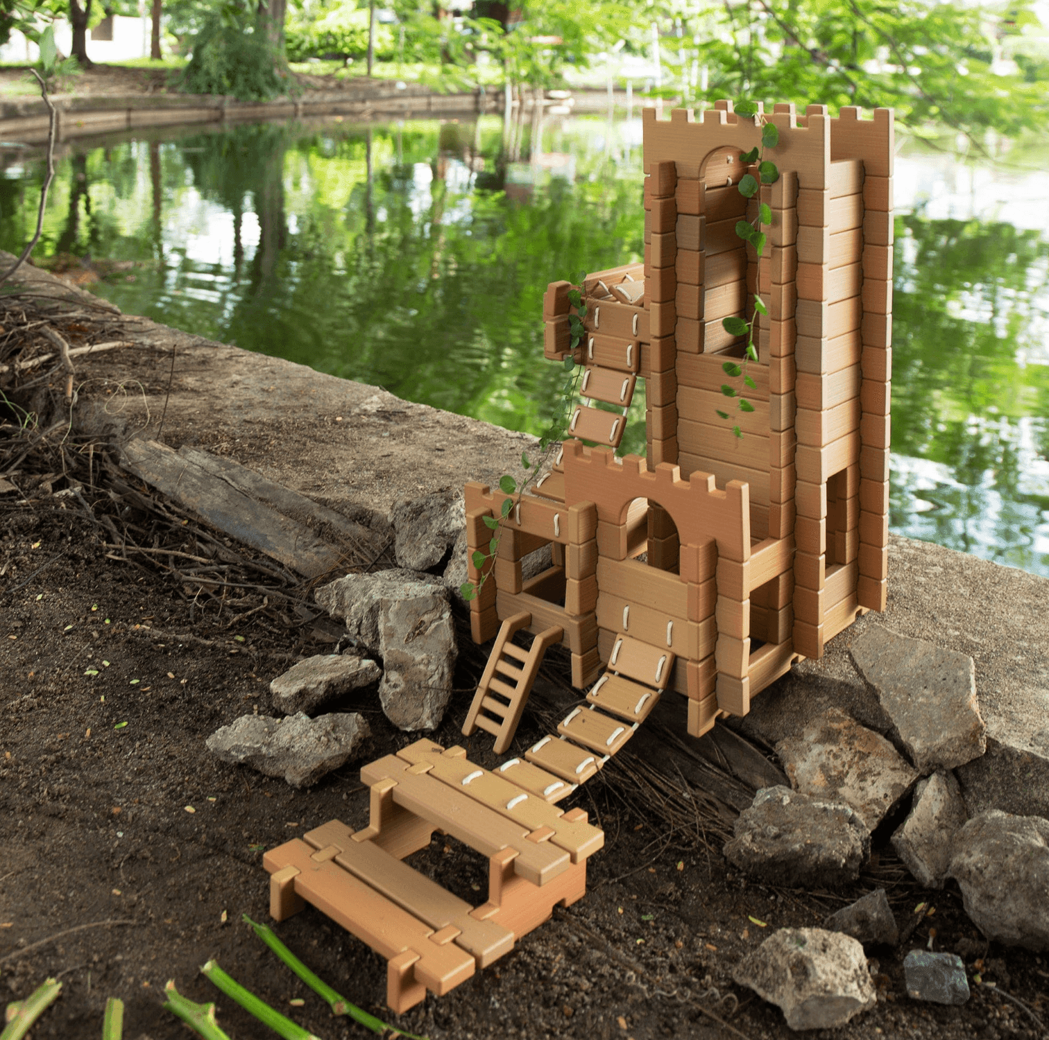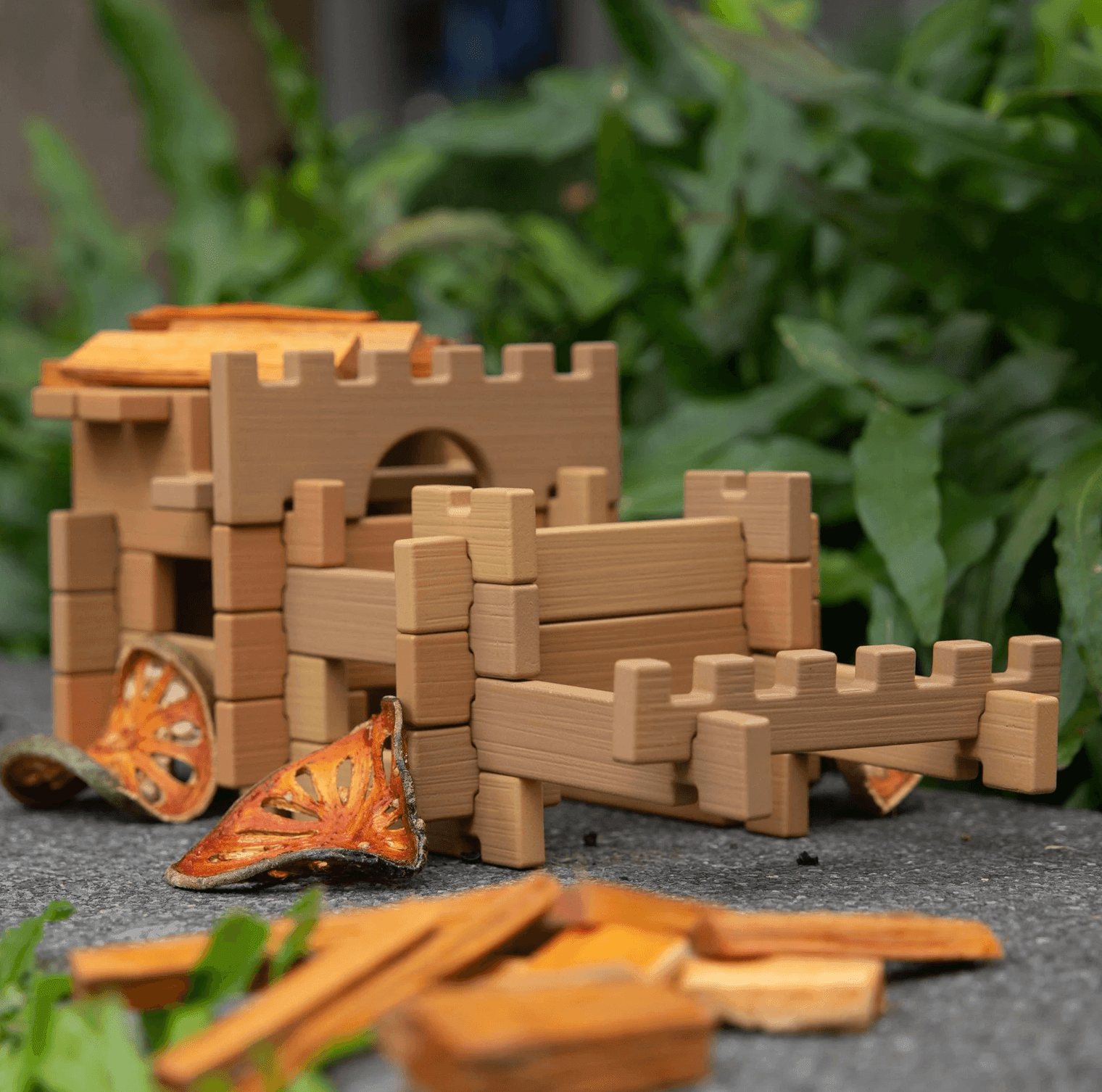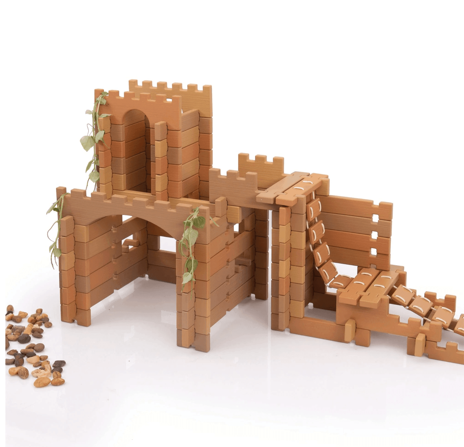 Children 3 and up can build using the Tabletop Notch Blocks – Western set indoors or outdoors. Plastic, neutral-colored blocks feature notched parts that easily connect for strong, detailed builds. Using included ladders and bridge pieces, children can build different structures with varying elevated platforms and span natural elements. 10-double sided inspiration cards provide images of relevant Western architectural design. Set features special parts with right angles inspired by Western architecture. Natural, loose parts not included.