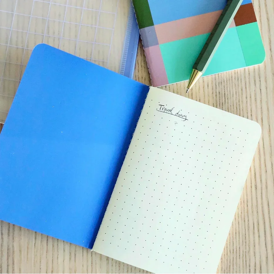 Includes two A6 notebooks (one lined, one dot), black ballpoint pen, notebook pen holder clip and reusable pouch.
