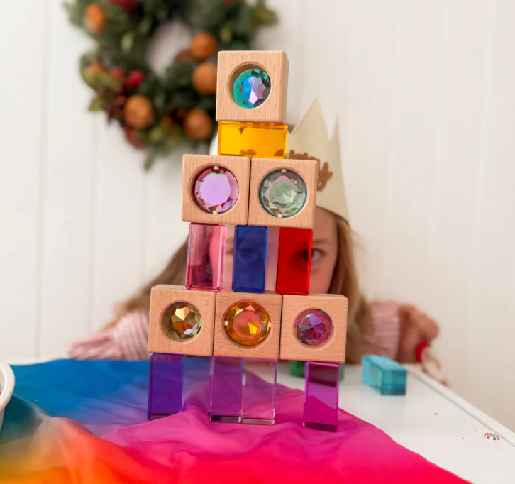 This stunning high-quality set combines vibrant lucite blocks and large faceted gems in a smooth wooden frame, creating the perfect blend of beauty and play. Each piece catches the light in magical ways, offering endless opportunities for stacking, sorting, colour matching, pattern play, and light exploration.