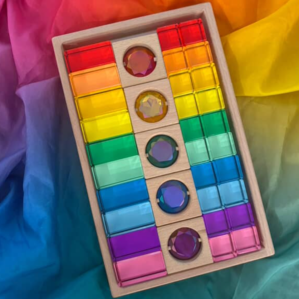See-through, colour-shifting building blocks for open-ended play, light-table exploration, and sensory invitations.