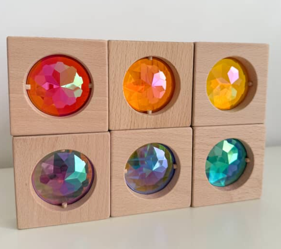Premium Jumbo acrylic gems (AB Aurora Borealis finish) set into GIANT solid beechwood blocks create dazzling reflections and a fresh way to see the world while building stunning structures.