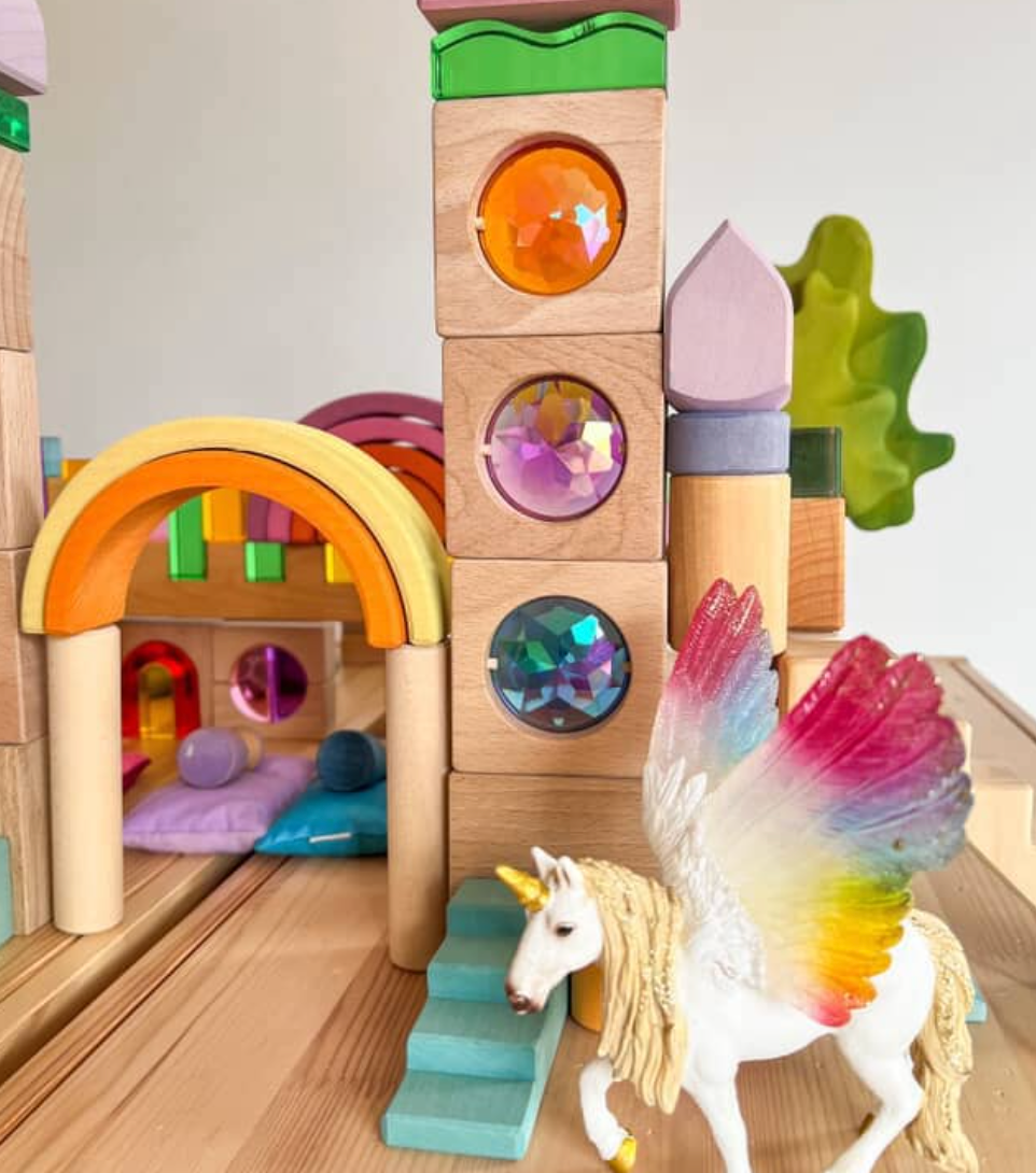 Brilliant, prismatic windows + satisfyingly chunky beechwood = instant kid magnet. These open-ended building blocks support fine-motor skills, early maths, visual perception, and creative problem-solving—without adding plastic clutter. Indoors or out, they’re an easy yes for Montessori-inspired and Reggio-style play.