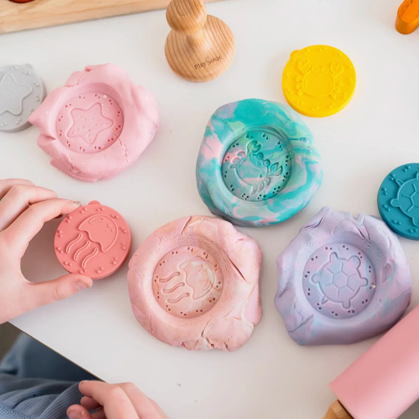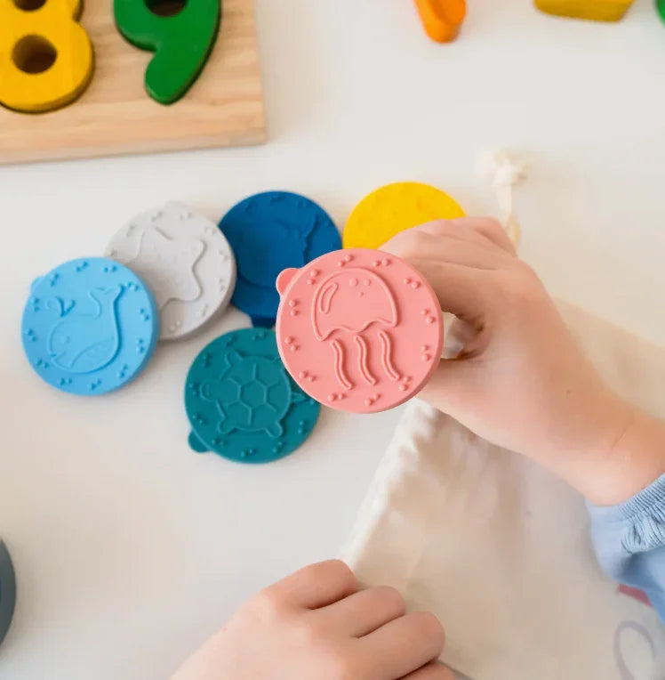Step into a world of limitless creativity with Play Sense Playdough Stamps! Crafted with adorable wooden handles perfectly sized for little hands, these stamps are bursting with possibilities. Each stamp features funky silicone caps and stashes away neatly in a cute drawstring bag for hassle-free storage. Dive deep into imagination with our Under the Sea set! Swim alongside friendly starfish, majestic whales, wiggly jellyfish, graceful stingrays, quirky crabs, and adorable turtles. Designed to play with Play Sense dough, but hey, why stop there? These stamps are ready to jazz up cookie dough or paint too! Get ready to sprinkle a whole lot of fun into any art project, sparking giggles and unlocking creativity galore!