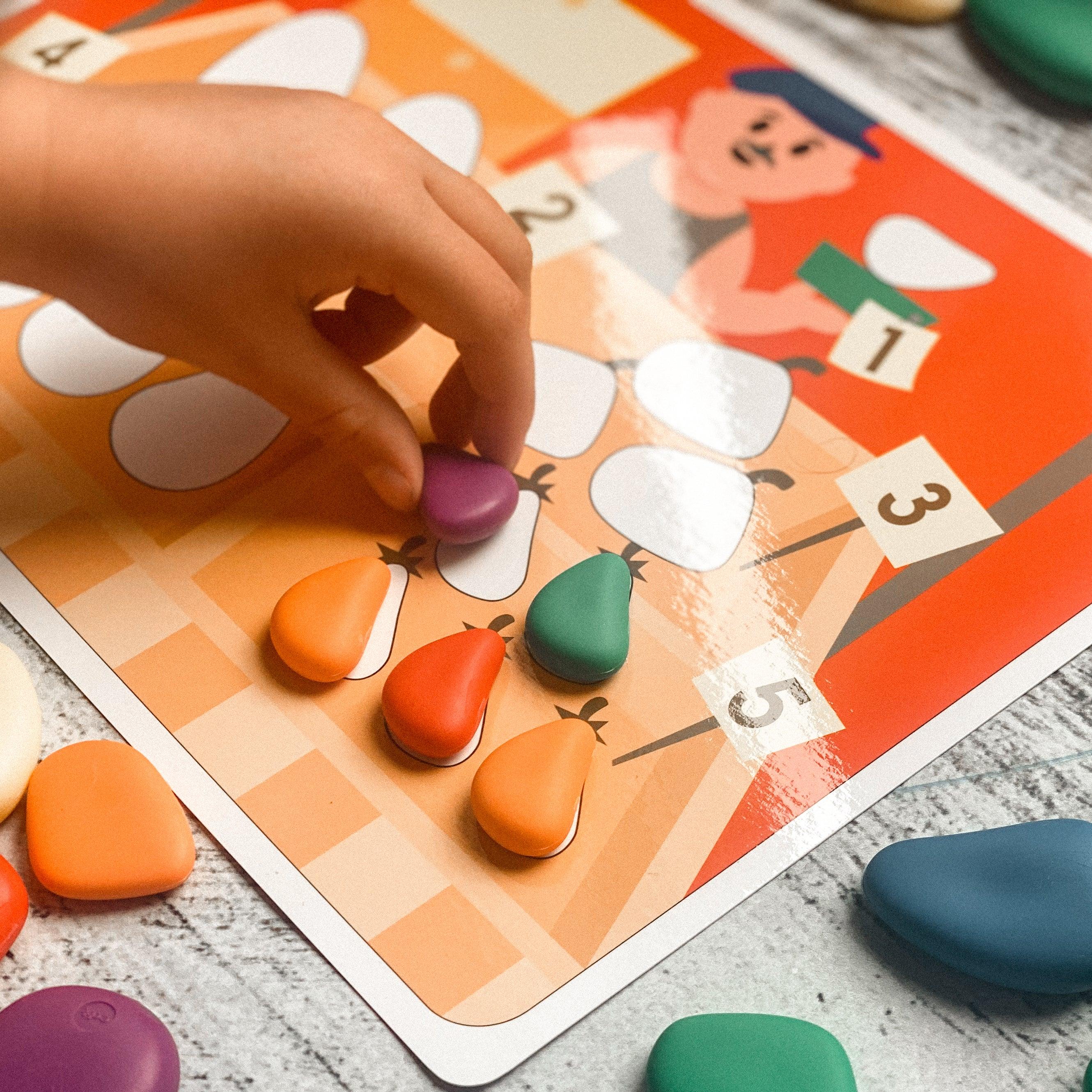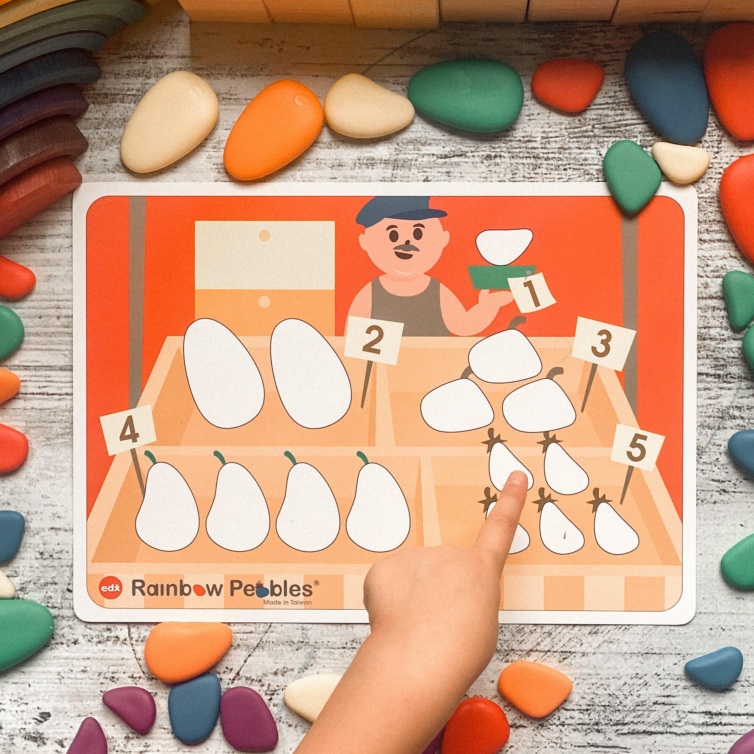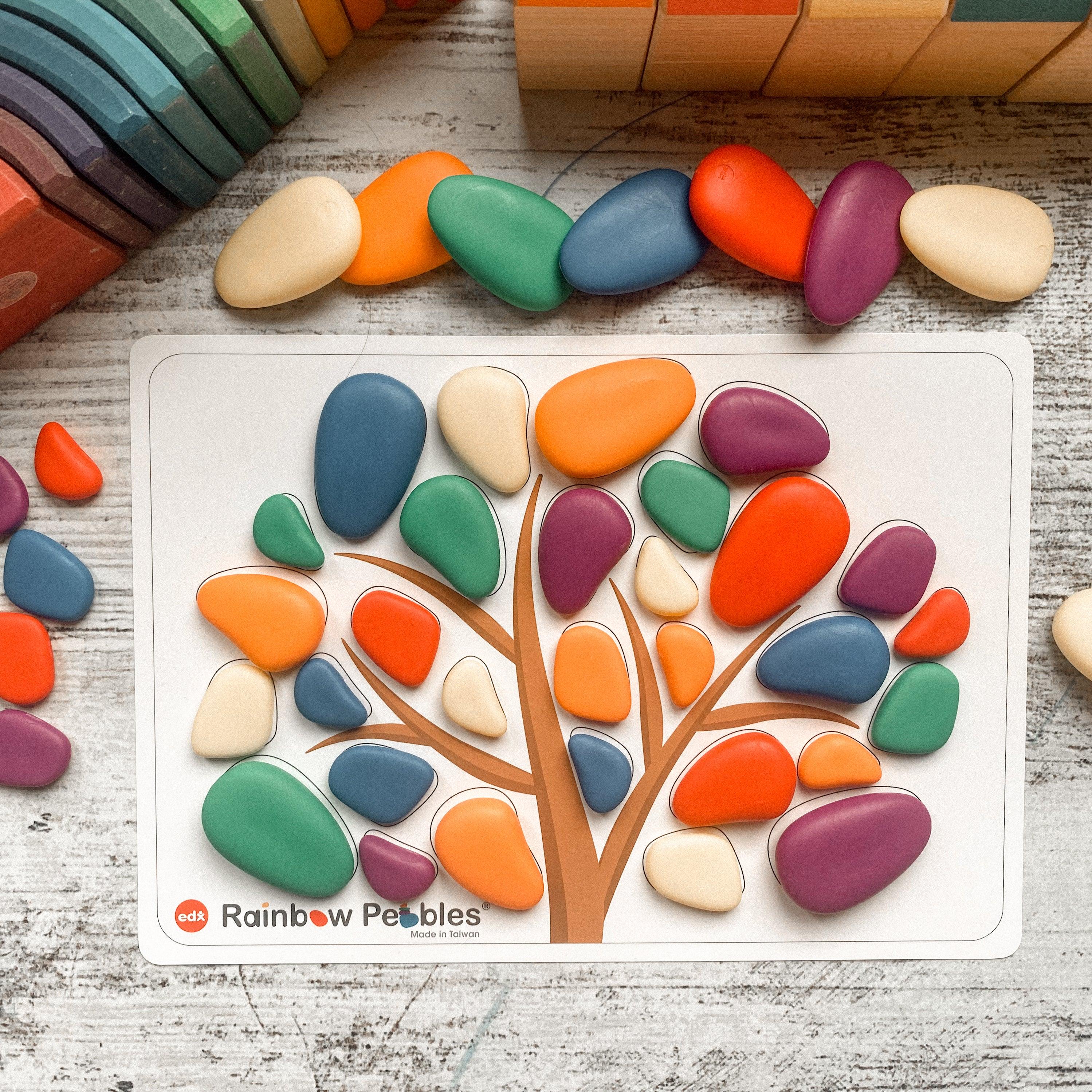 Set includes 36 pebbles in 3 sizes and 6 colours, and 8 double-sided activity cards.