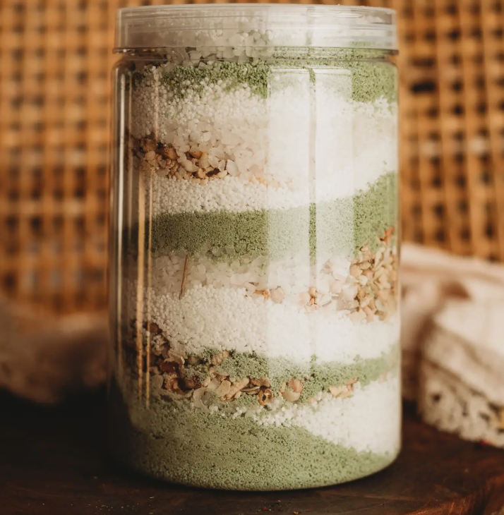 An olive green and white fizz mixed with delightful tiny sea shells and rock salt, for potion play. Just add water!