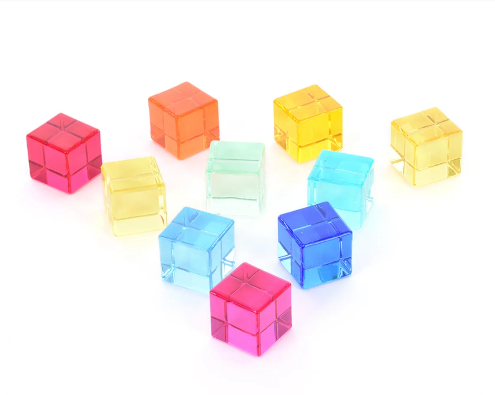 Stunning crystal coloured gem cubes in 10 different colours. Made from solid acrylic and beautifully finished with smooth edges.
