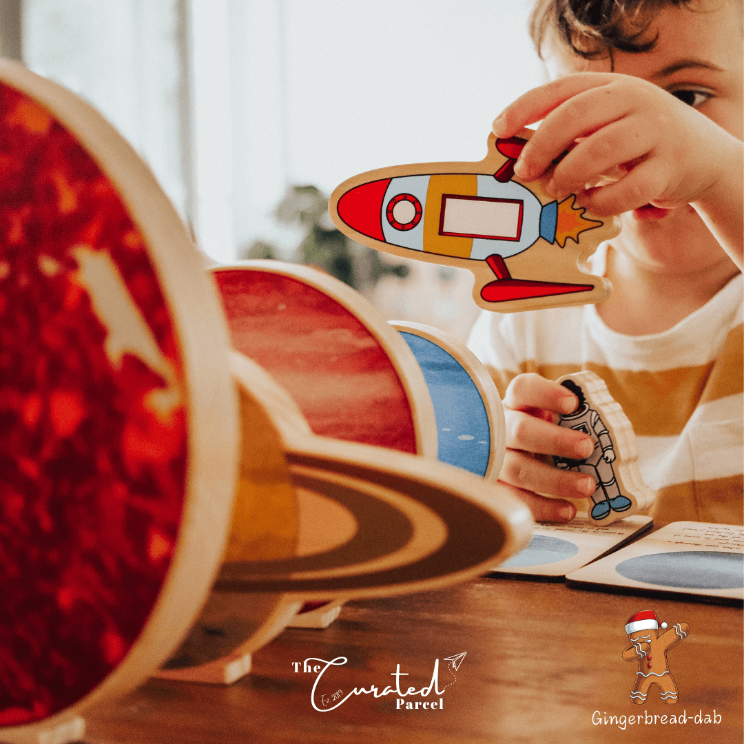 Time to explore our universe by taking a trip into space. This 12 piece solar system comes with all the planets in our solar system, both a male and female astronaut and a rocket. Perfect for imaginative play as well as a great conversation starter to introduce interesting facts about our Solar System. This is an excellent toy for children to promote social and imaginative play while encouraging them to feel positive and confident while they learn through play. The generously sized pieces have been printed using non-toxic heat transfer technology to ensure longevity of the artwork.
