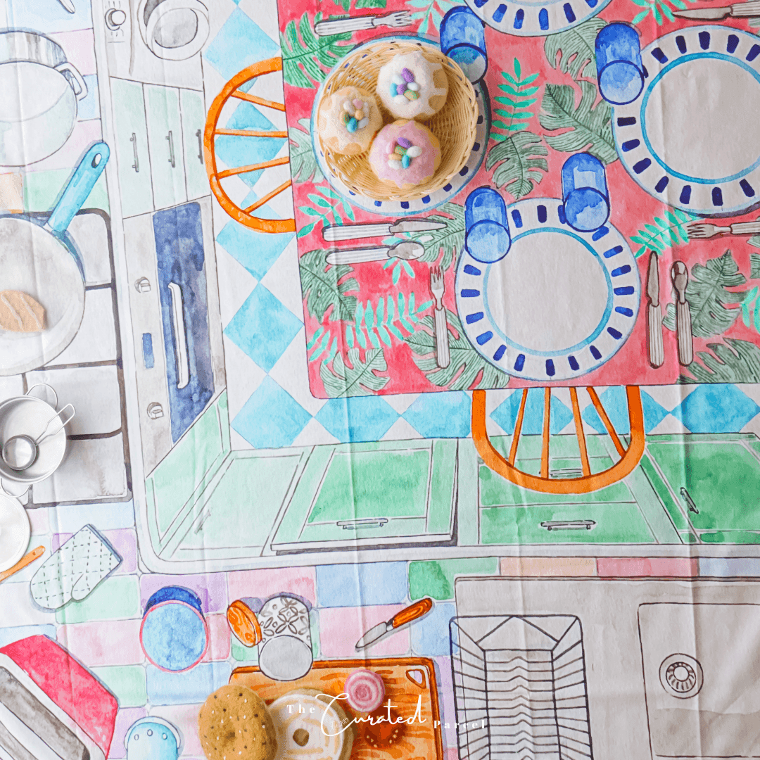 Littles can etner a world of wonder with this beautifully illustrated cloth. Featuring many cozy rooms, a charming attic, and countless details to discover there’s much to explore. Whether they add little dolls and figurines or let their imagination run wild, this beautiful piece is sure to be loved by your little ones.