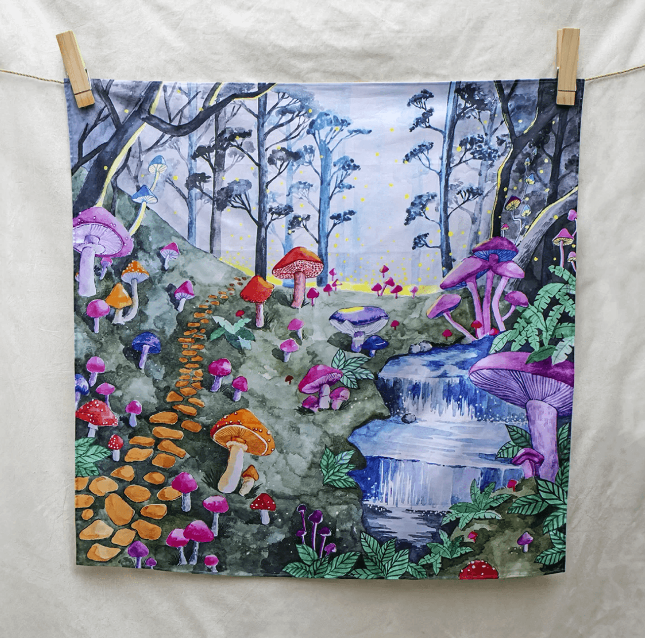 Step into a mystical mushroom world, where the air is filled with enchantment and a meandering trail leads through the heart of this magical realm. Neon mushrooms and whimsical toadstools adorn the landscape, creating an otherworldly scene that captivates the senses.