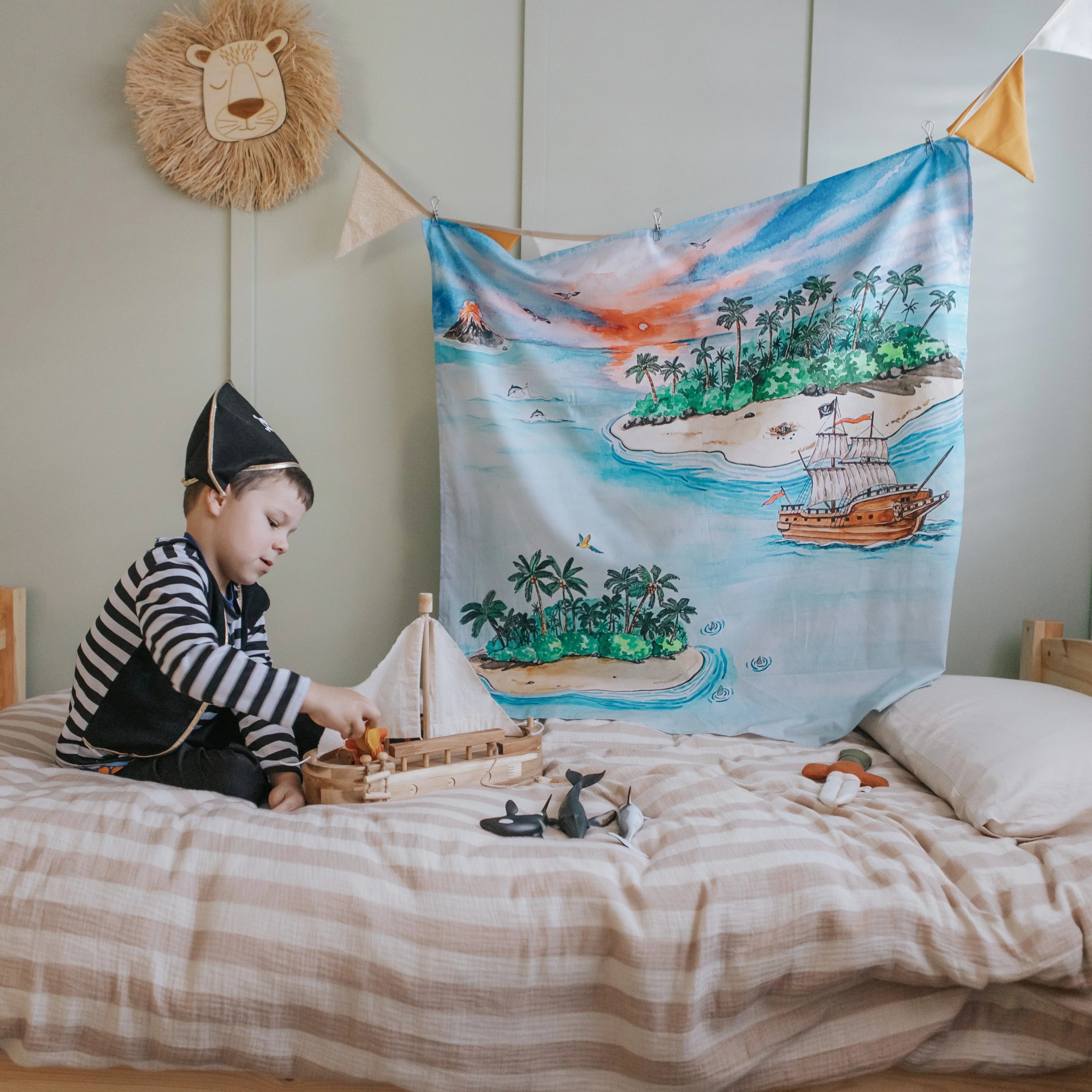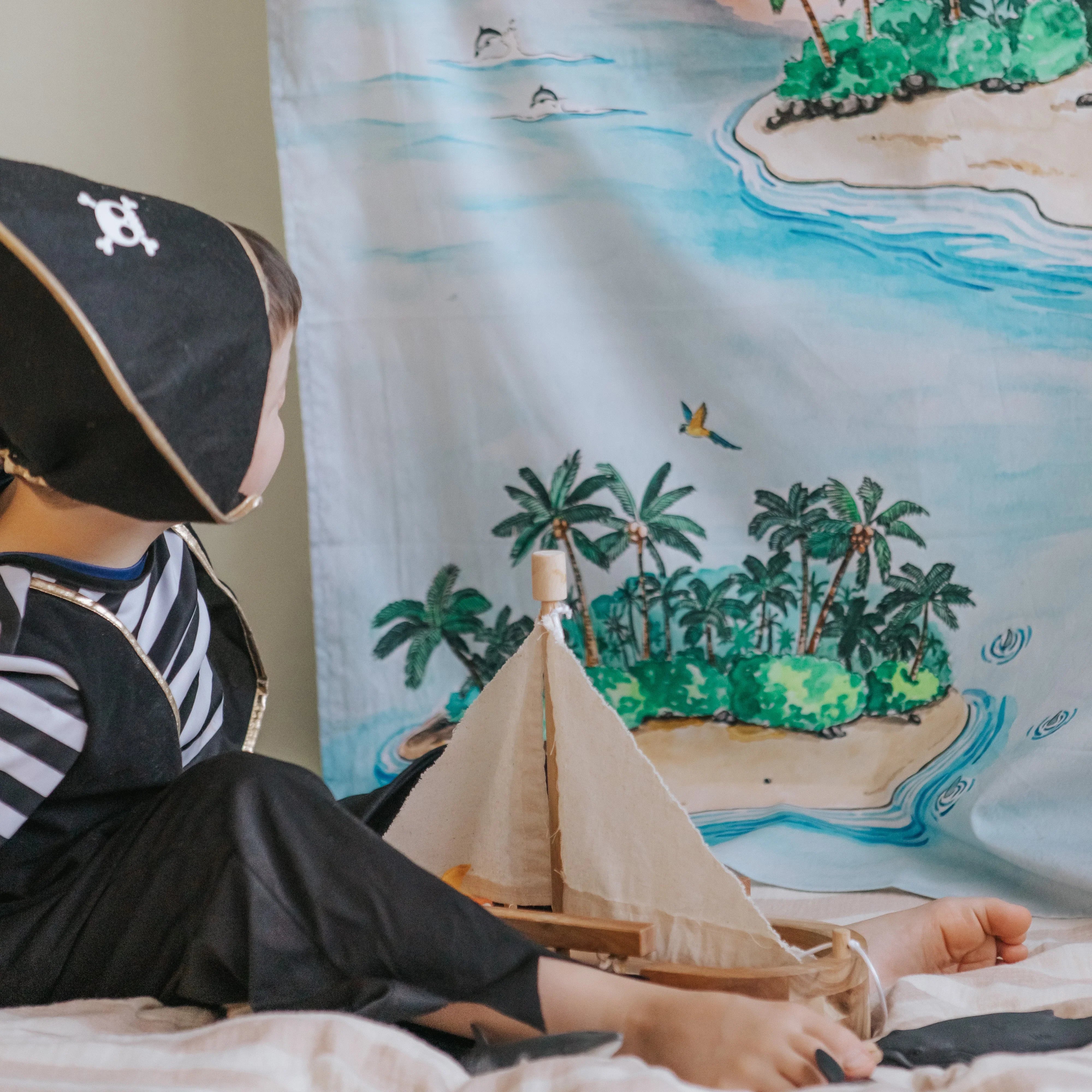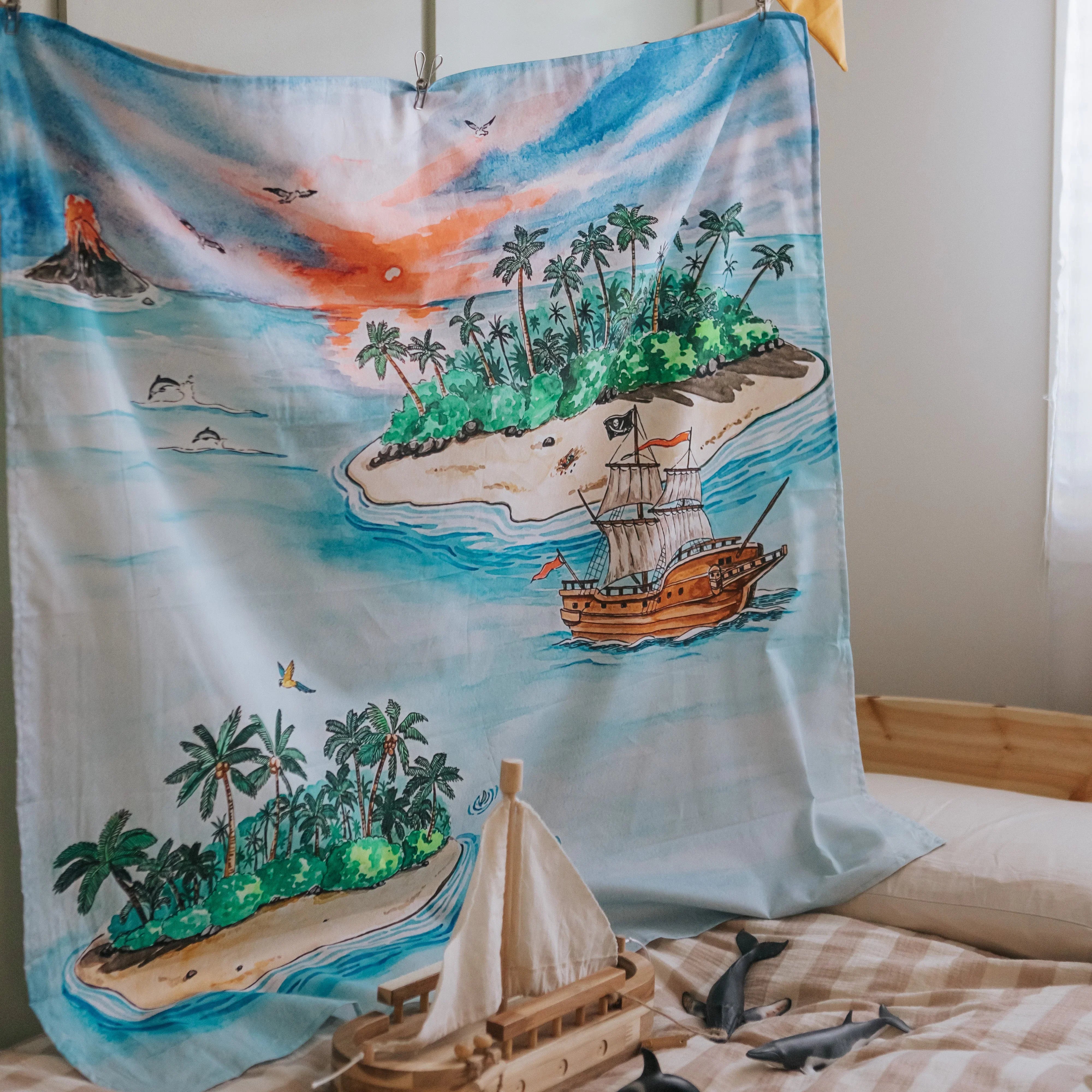 Set sail for adventure with this beautifully detailed cloth! Featuring a pirate ship, a fiery volcano, treasure on a sandy beach, and swaying palms, it’s perfect for little ones who love the sea and all things pirate.
