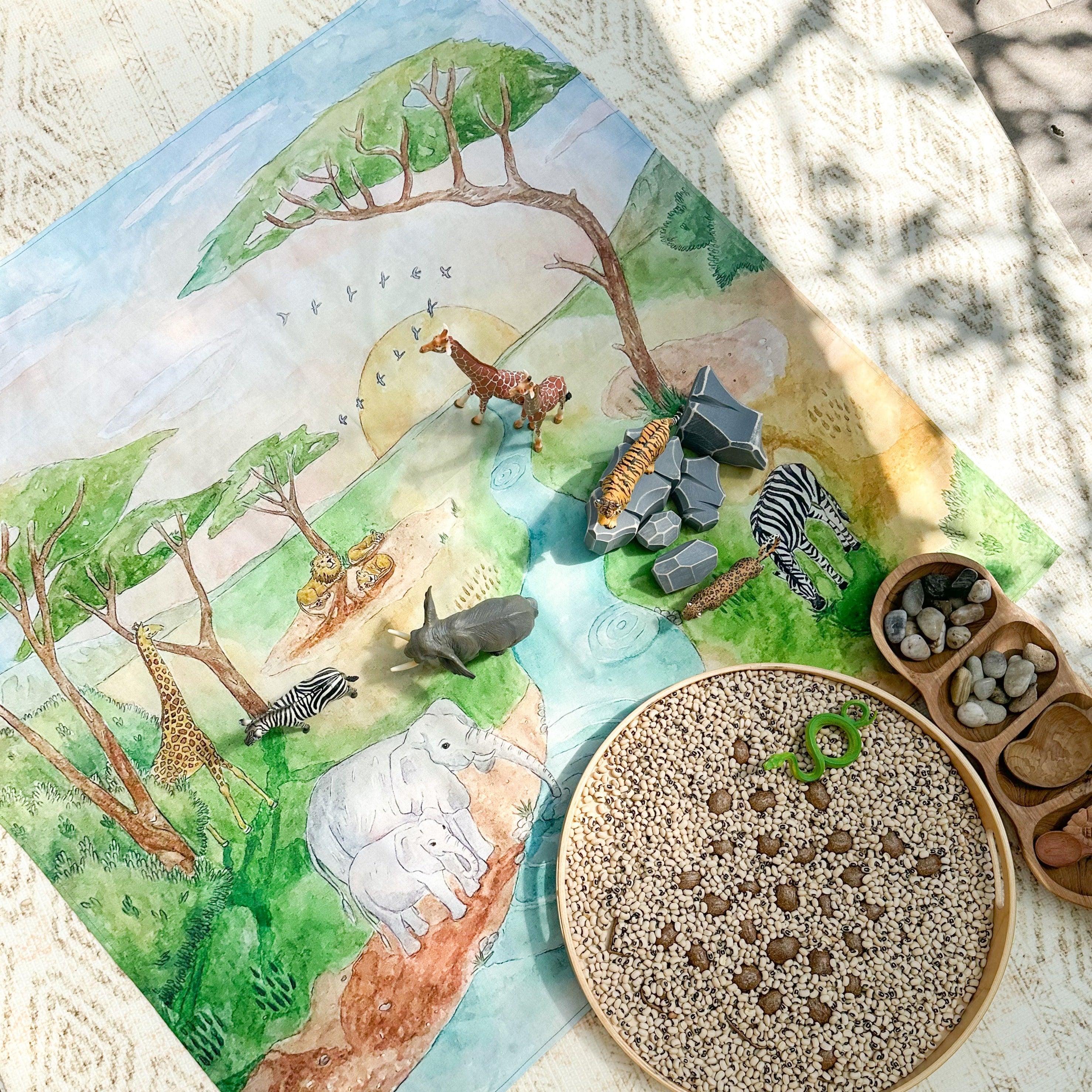 Behold the majesty of the African savannah with this beautiful cloth. Lions and zebras roam amidst golden grasses, while the setting sun paints the sky in hues of orange and gold. The flowing river whispers tales of the wild, beckoning little ones to enter a world of adventure.
