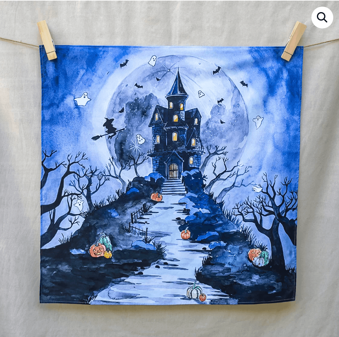 On a moonlit hill, a haunted manor stands tall, surrounded by pumpkins and playful ghosts. A witch swoops through the night sky, casting a spell of enchantment. This fun and spooky cloth invites kids to dive into a Halloween adventure full of mystery and magic.