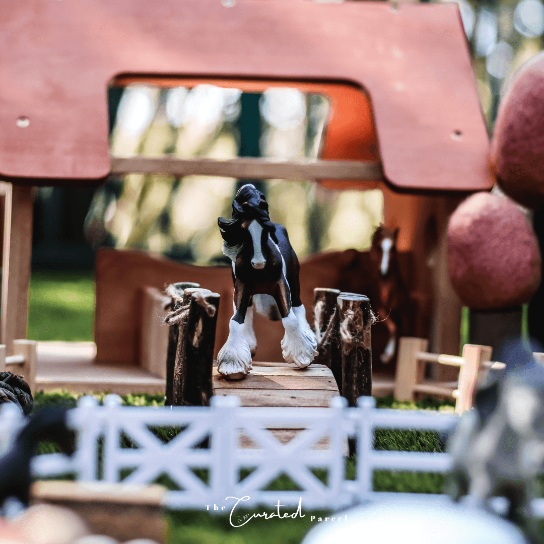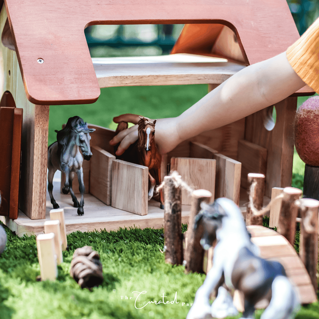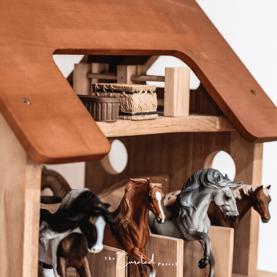 Gorgeous horse stable for imaginative and pretend play for your little ones. This wooden stable houses up to 6 small horse models (not included), and has hinged doors to make it even more interactive!