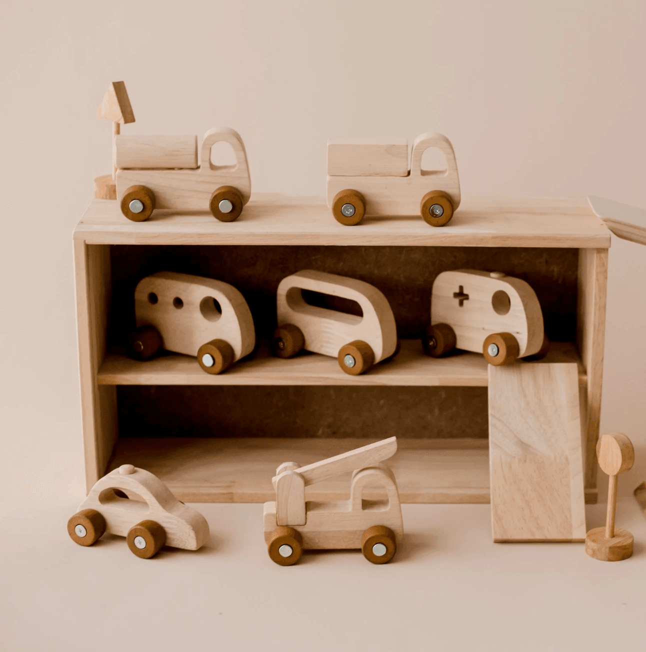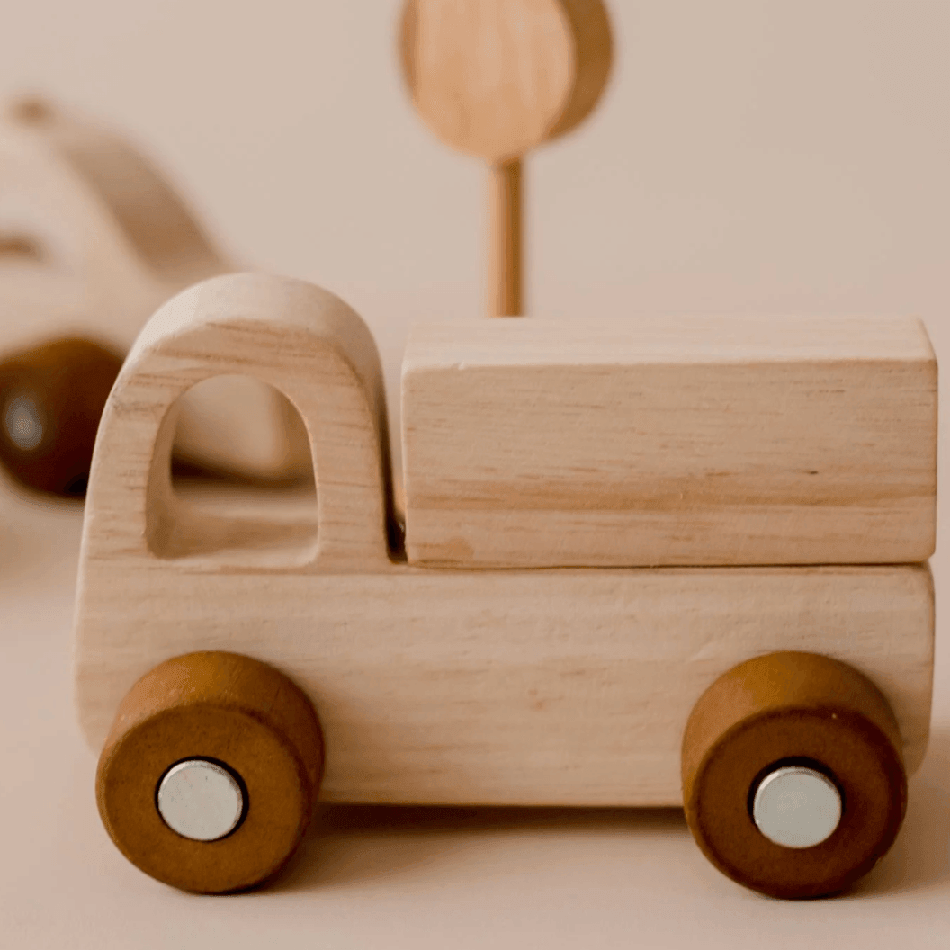 This beautifully made, raw timber vehicle play set comes with 7 different types of vehicles, a bumpgate, traffic signs, bridge, and storage box that functioned as a garage. Your babe will love moving the cars up and down the ramp and into the garage. New 2 Tone Colour!