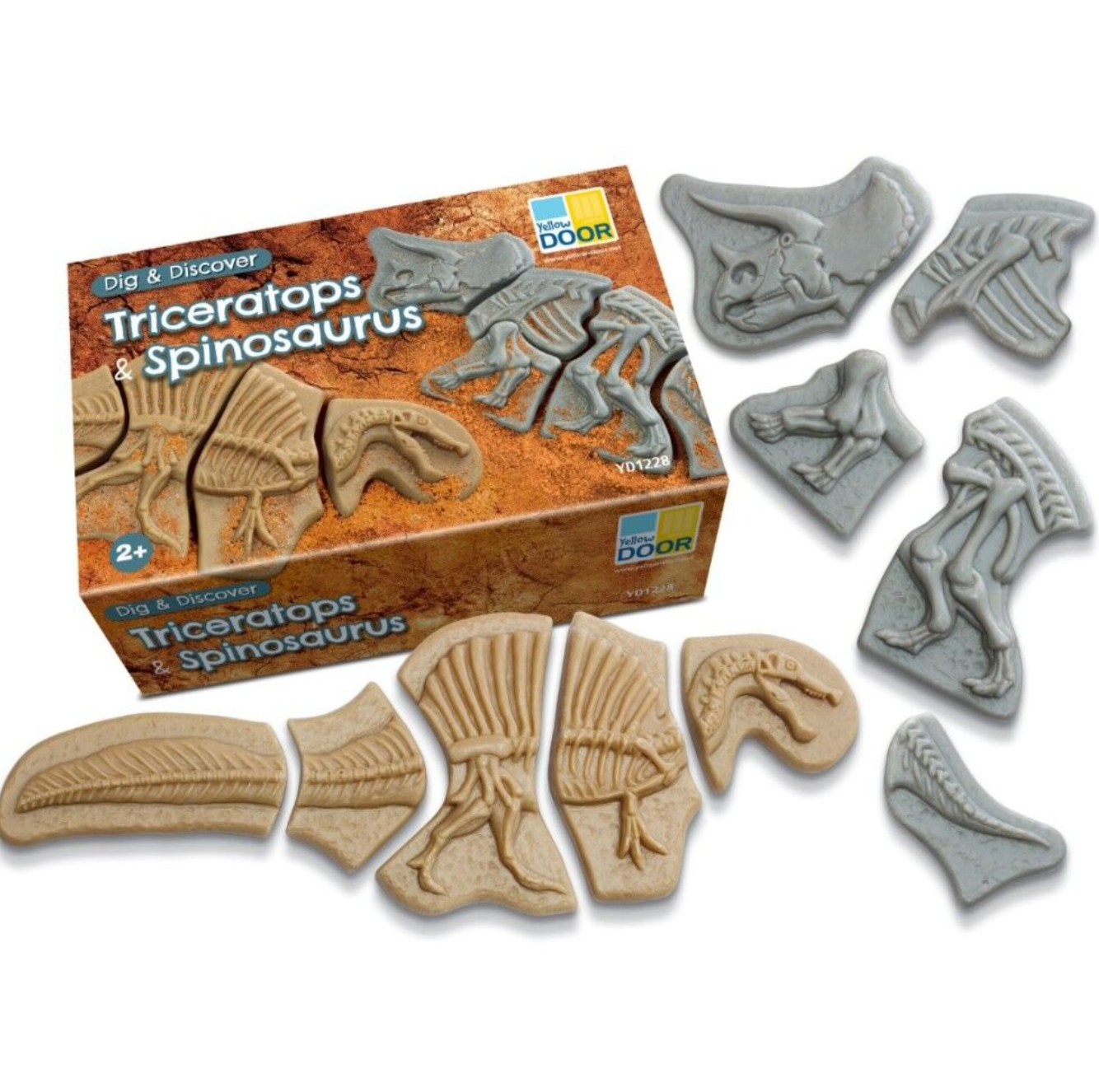 Embark on a prehistoric adventure with these two engaging dinosaur skeleton puzzles: the three-horned Triceratops and the fearsome Spinosaurus! Made from a durable stone mix, these chunky, tactile pieces are built to last countless excavations in sand or soil. As children unearth each piece, they will be honing their observational skills by paying close attention to shapes and details that will help them assemble the puzzle. Piecing the skeletons together offers a rewarding challenge, helping children to think spatially, making connections between each part to complete the dinosaur.