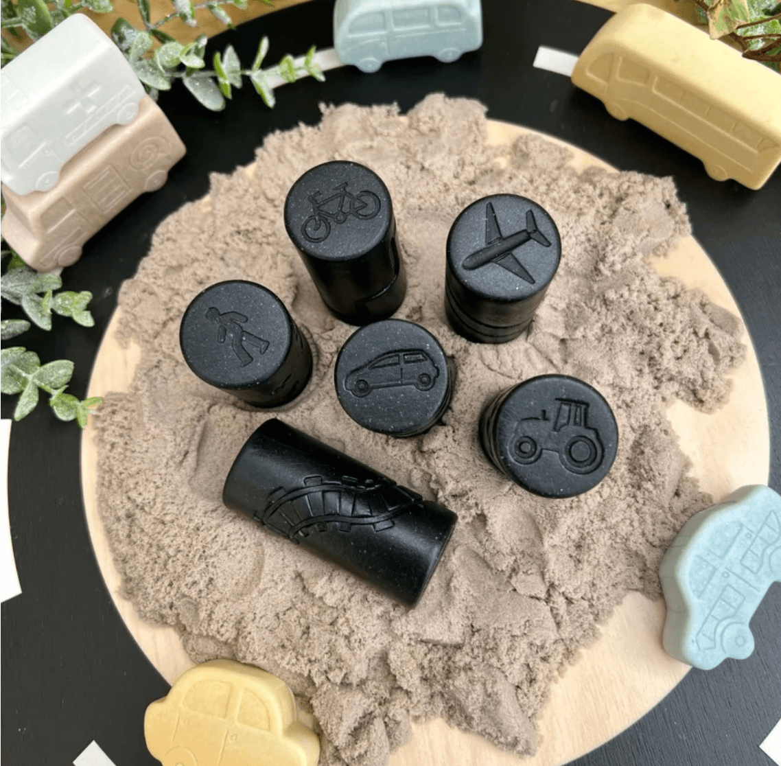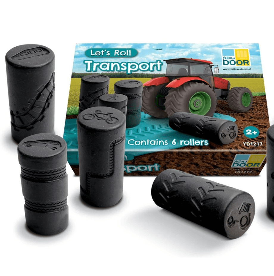 The set includes: train & railway track, car and two treads, bicycle and single track, plane & contrails, tractor & two tracks, and pedestrian & footprints. Made from a durable stone mix, each set contains six rollers each measuring 72 x 34mm and are easy-to-clean.
